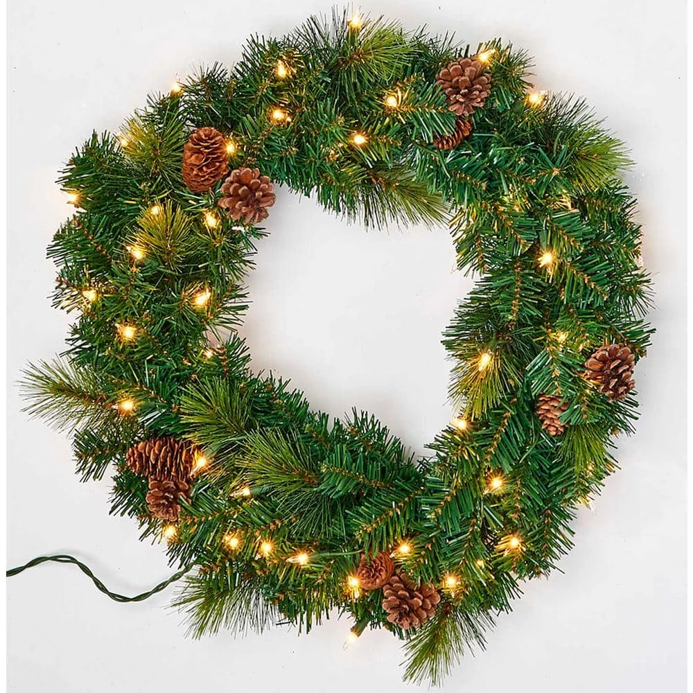 If you are looking for a fine and elegant touch for your decor this holiday, our pine and cone 22 in. LED Lighted PVC wreath will fill your desire. The wreath has 50 clear lights among the pine, accented with pine cones and the pine is wired for easy shaping. This wreath will for sure be the perfect accent to any Holiday and Christmas decoration.