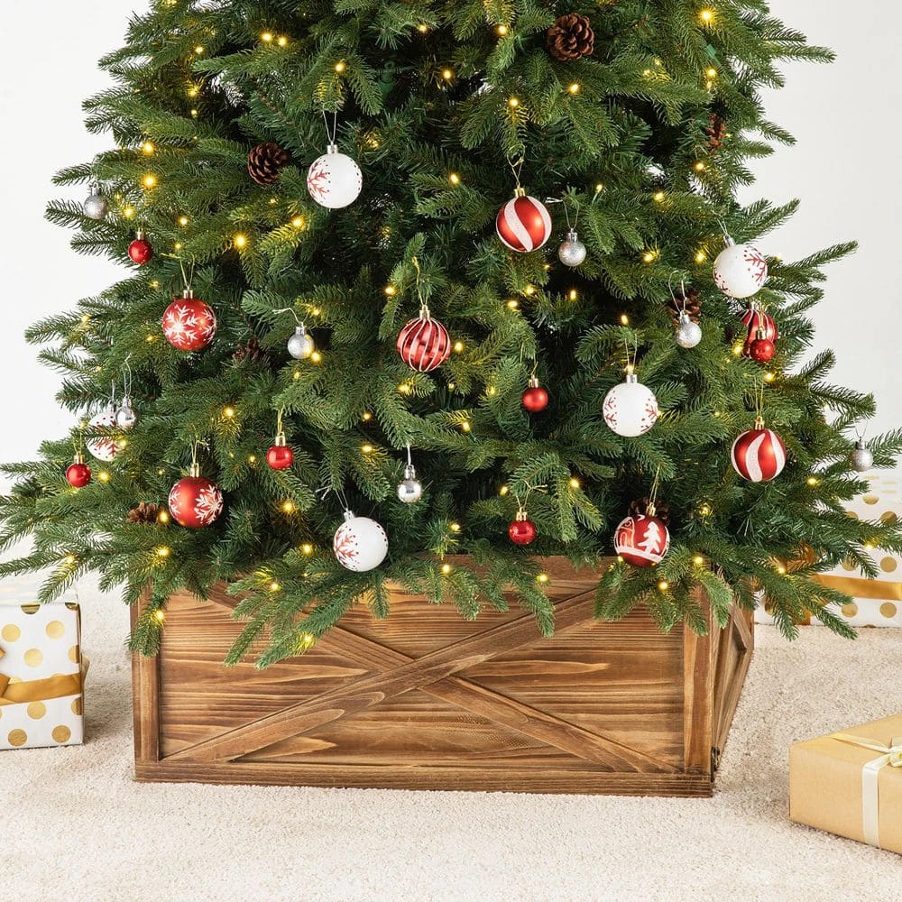 Our handcrafted tree box collars add a rustic, elegant charm to any home or business. The tree boxes not only add beauty and hide the undesirable parts of your tree, but they also prevent kids and pets from getting into the bottom side of your tree. They are stained in natural wood finish.