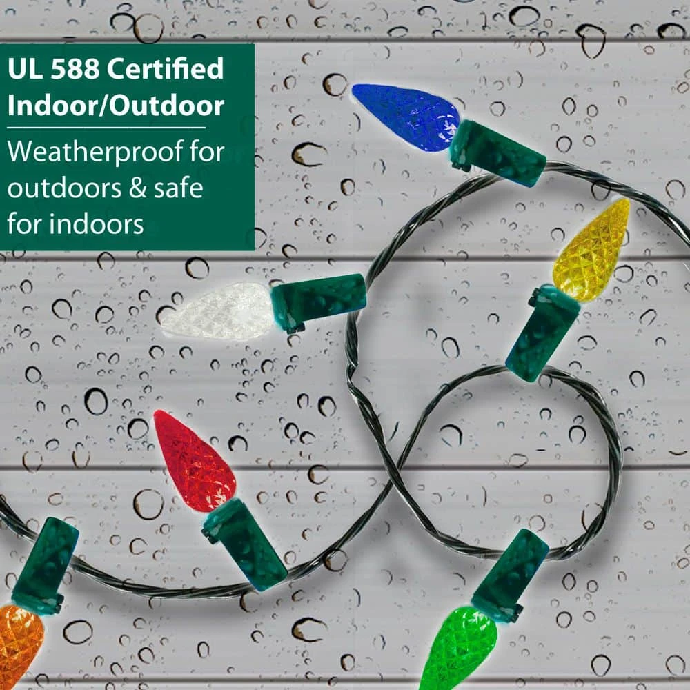 Blue C6 LED bulbs bring a classic, old-fashioned ambiance to your holiday decor. LED lights save energy are cool to the touch, making them safe around children and pets. Each strand has 35 bulbs and measures 12 ft., including a 4 in. lead cord, 4 in. spacing between bulbs and 4 in. end cord. Includes spare bulbs and fuses. Strung on green wire to blend in with Christmas tree and exterior landscaping. Set of two, 35-light strings for 70 total bulbs. Suitable for indoor and outdoor use. UL-listed. Box of 2.