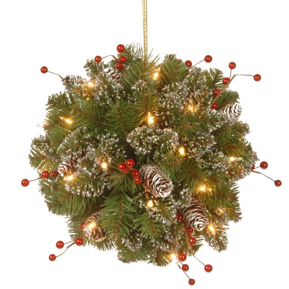 The Glittery Mountain Spruce Kissing Ball is a mixed branch decoration with glittered tips for added sparkle. It is trimmed with white-tipped pine cones and red berries, and is pre-strung with 35 battery-operated warm white LED lights that are energy-efficient and long lasting. 6 hours ON/18 hours OFF timed operation. Hang this unique holiday decoration in indoor or covered outdoor locations.
