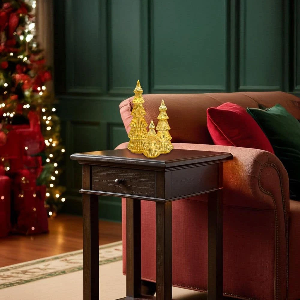 This set of 3 gold battery operated trees will add an elegant touch to your holiday decor. These lovely glass trees are filled with warm white LED fairy string lights equipped with a timer for 6 hours on and 18 hours off. They will add a delightful glow anywhere you place them, whether it’s on a mantel, tabletop, or shelf. Each tree requires 2 AA batteries (not included).