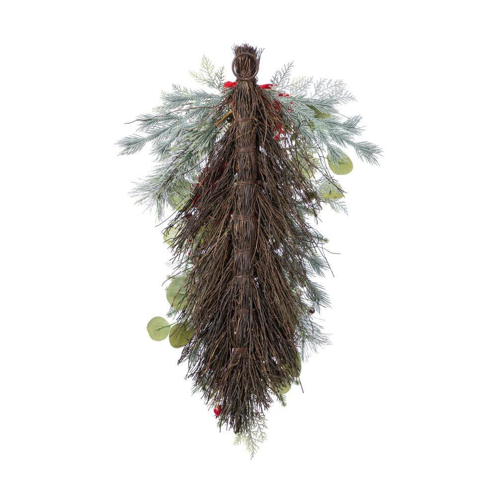 The 28 in. H Christmas Red Magnolia and Berry Teardrop features a graceful teardrop design crafted from lush green pine needles, accented with vibrant red magnolia blooms and berry clusters. This elegant piece brings a sophisticated yet festive flair to your holiday decorations with its rich botanical elements. Perfect for elevating your Christmas ambiance, it adds a refined natural charm to any living space.