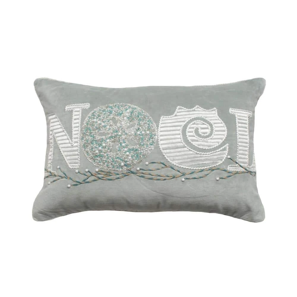 Bring the beach with home with you for Christmas with this coastal accent 14 in. x 20 in. pillow. Noel is spelled out with embroidery and beads. The sand dollar letter O is outlined in tiny white beads and filled in with gold and white and seafoam colored beads.