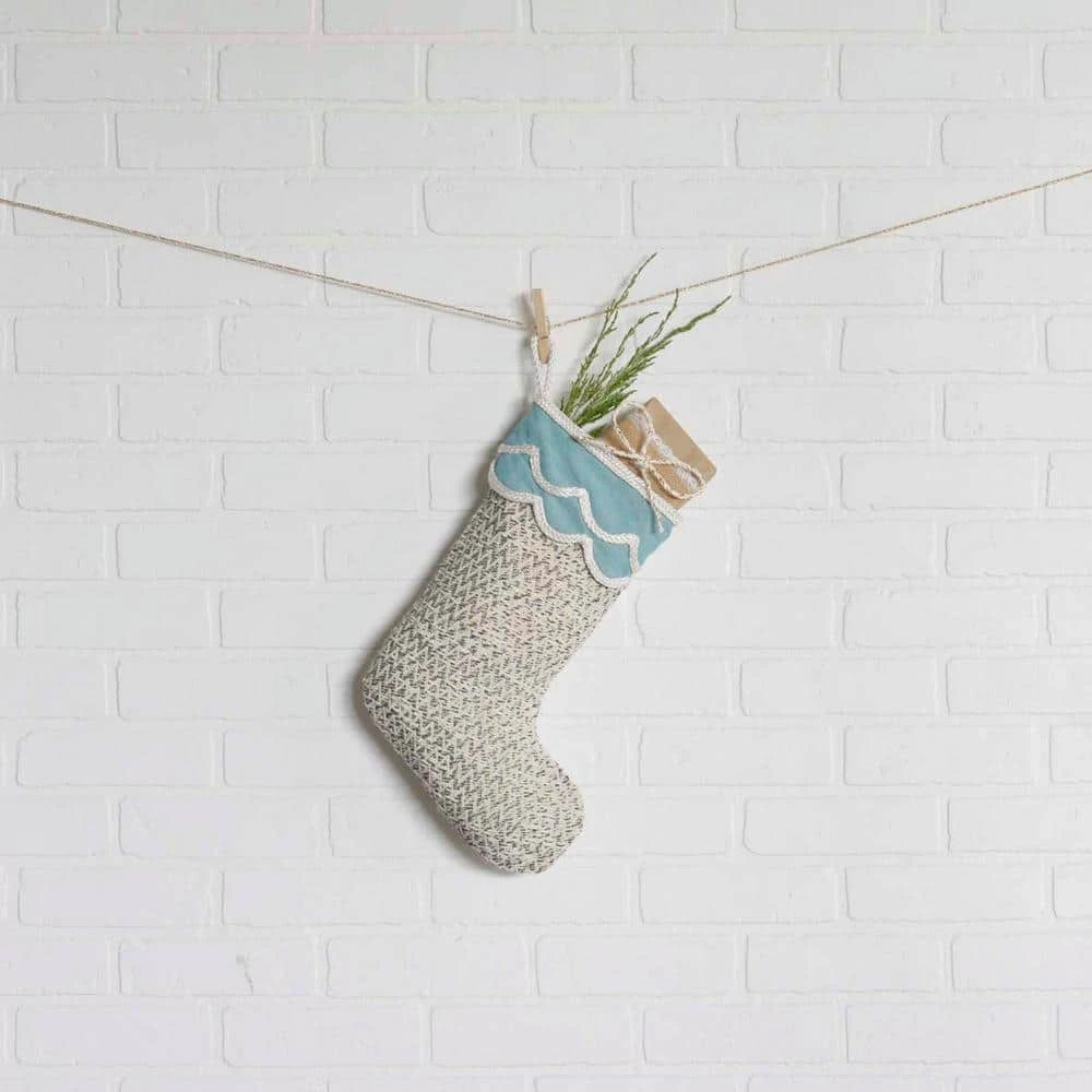 Wake up to the beach look this year with the Sanbourne Stocking. Featuring a shiny rope embroidery for a wave effect over turquoise on the cuff and the body in a beautiful and sturdy textured creme and caviar jacquard cotton, the stocking brings the water and Christmas morning together. This item was made with care to decorate your home for many years.