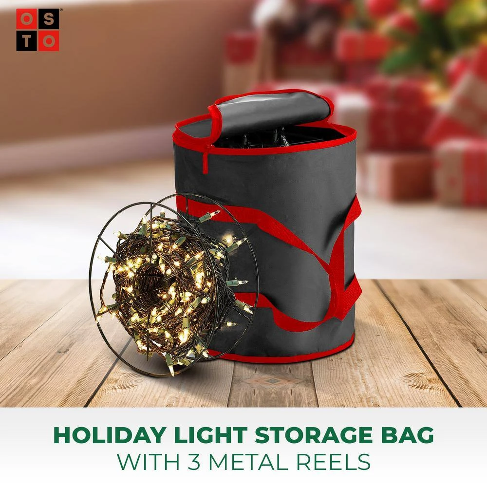 - Floor saver-don’t be deceived by its small figure, holds a total of 240 ft. of Christmas lights and comes with the benefit of storing it just about anywhere, strictly because of its small and round shape, bag fits in places where larger storage bags don’t, therefore saving you floor space