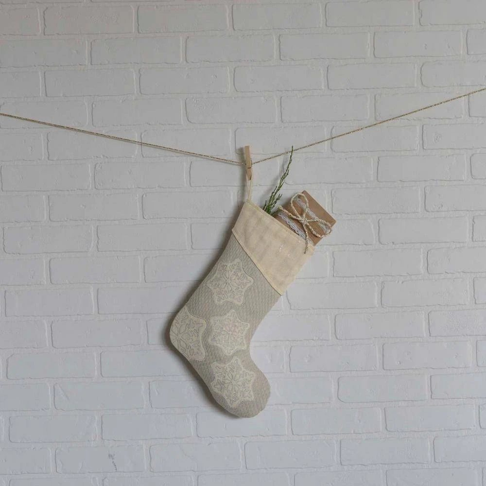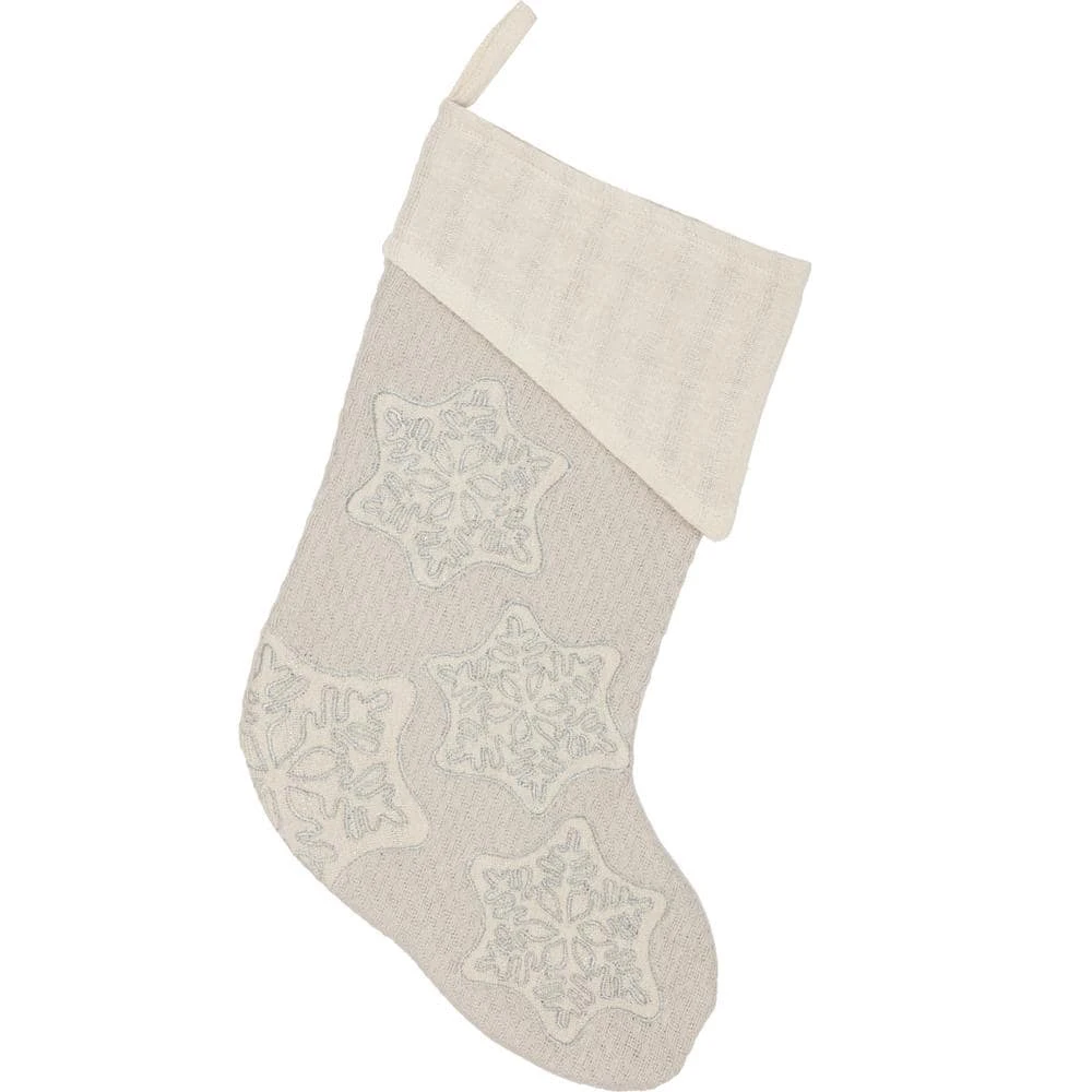 Ingrid is a White Christmas design with a textured holiday look. The Ingrid Stocking brings a touch of the north to your Christmas morning with an ash grey woven cotton, appliqued snowflakes in antique white tobacco cloth with silver lurex for a holiday glimmer. This item was made with care to decorate your home for many years.