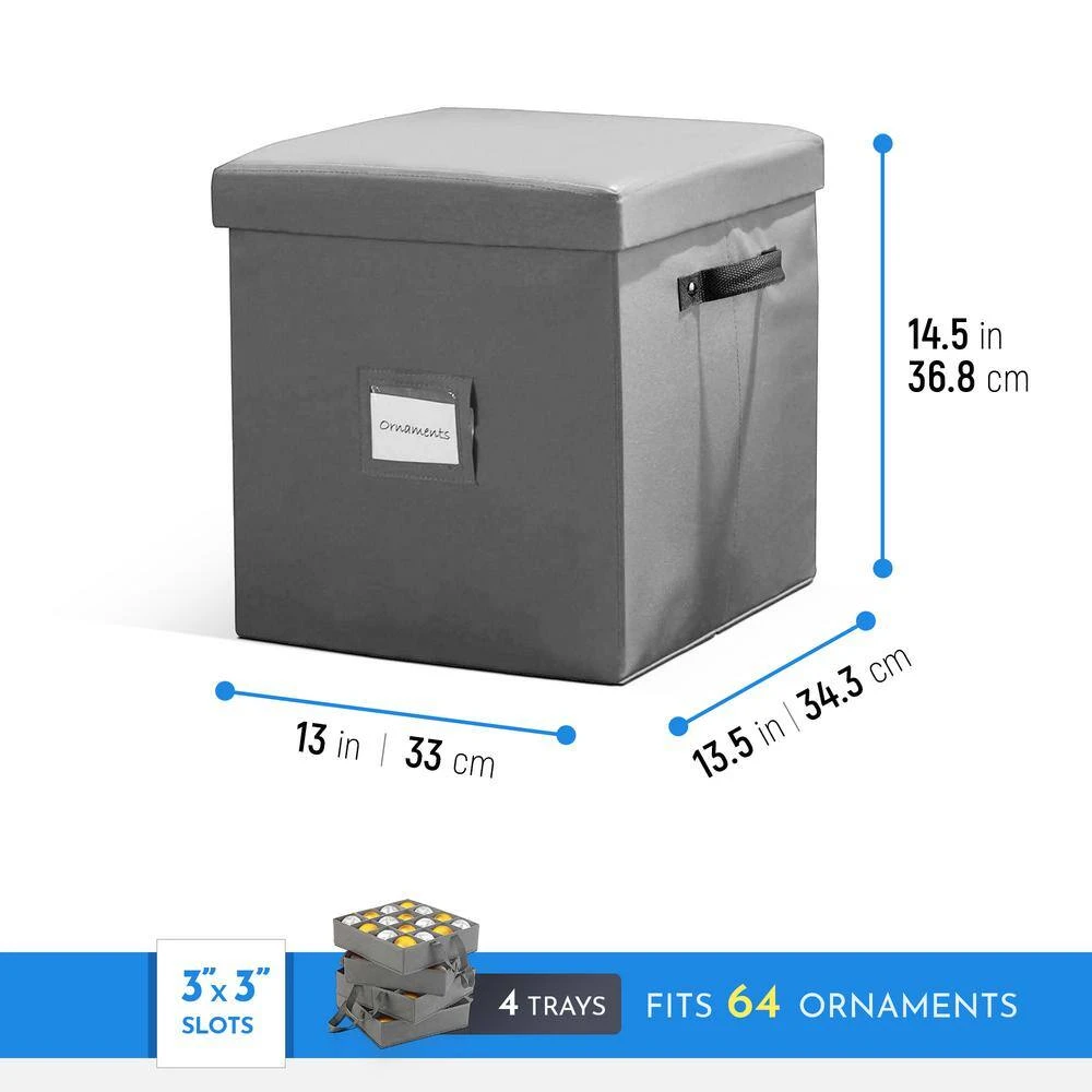 - Multi-purpose ottoman and storage-have your collection of ornaments neatly, conveniently, and individually stored, during the overwhelming holiday festivities, box doubles as a footrest, step stool, and seat, dimensions: 15 in. x 13.5 in. x 13.5 in.