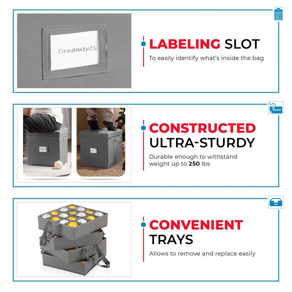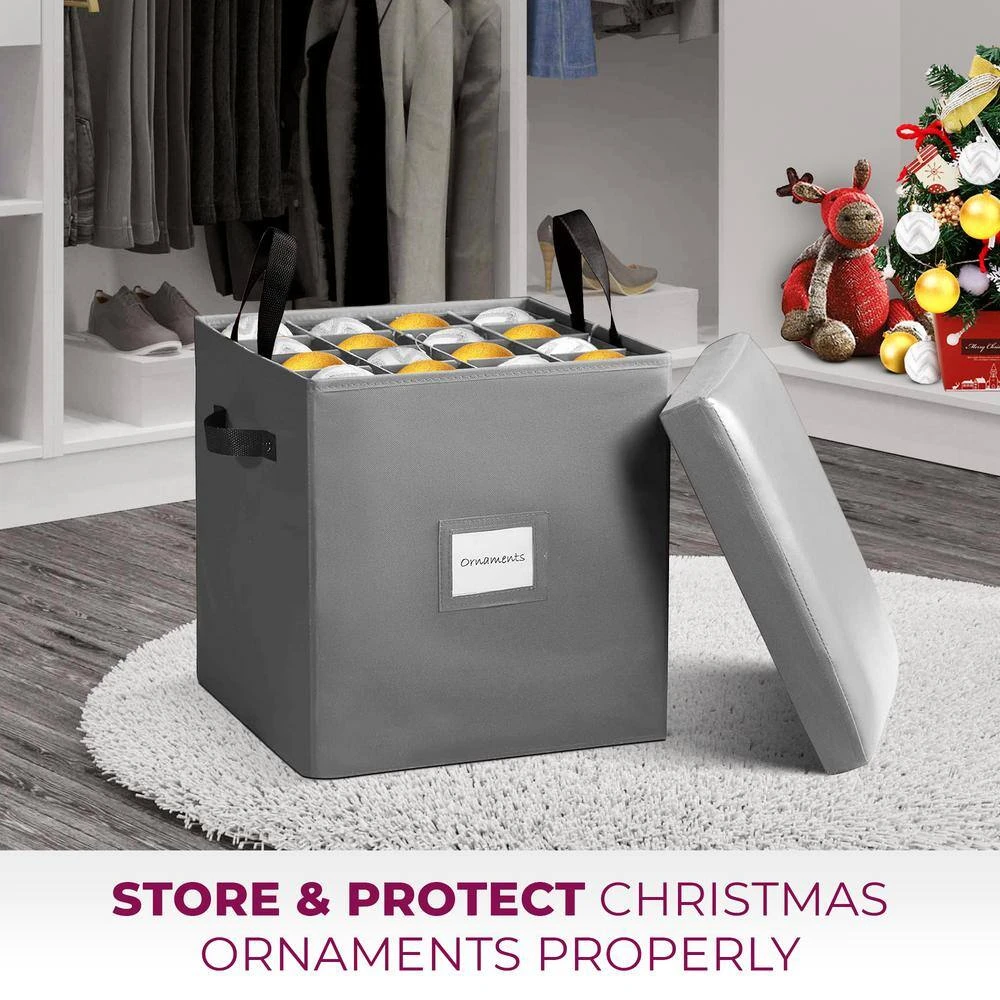 - Removable carry trays- box includes 4 durable trays with a pair of handles on each, for simple insertion, removal, and carriage, each tray has 16 slots of 3 in., totaling 64 slots. cardboard dividers can be customarily arranged to fit even the larger ornaments