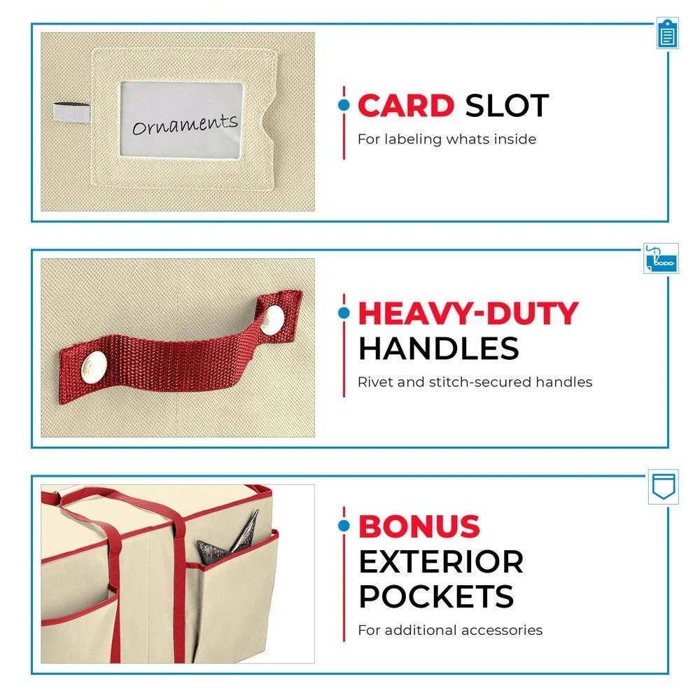 - Storage box-organizer is of thick non-woven fabric, which is of breathable material and is secured against dust, mites, and mold, holds 8 larger ornaments of 15 in. H, comes with carry handles, card, slot, 2-way zipper, and pockets, dimensions: 24.5 in. x 12.2 in. x 15 in.
