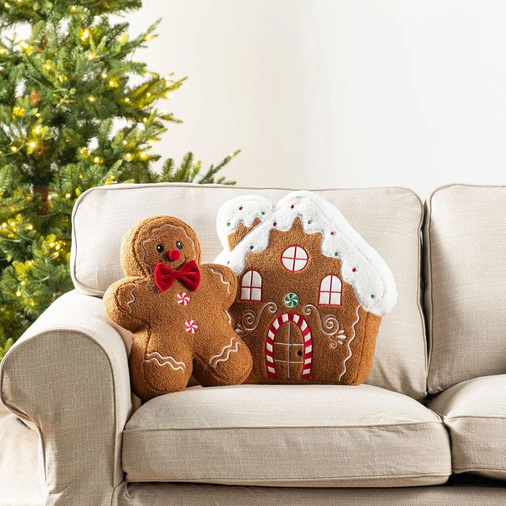 The 17 in. H Christmas Pillow features a soft plush construction designed to resemble a charming gingerbread house, complete with a candy cane door and intricate white icing details. Topped with a delicate dusting of snow, this whimsical pillow adds a cozy and festive touch to your holiday decor. Perfect for sofas, beds, or seasonal displays, it instantly brings warmth and Christmas cheer to any room.