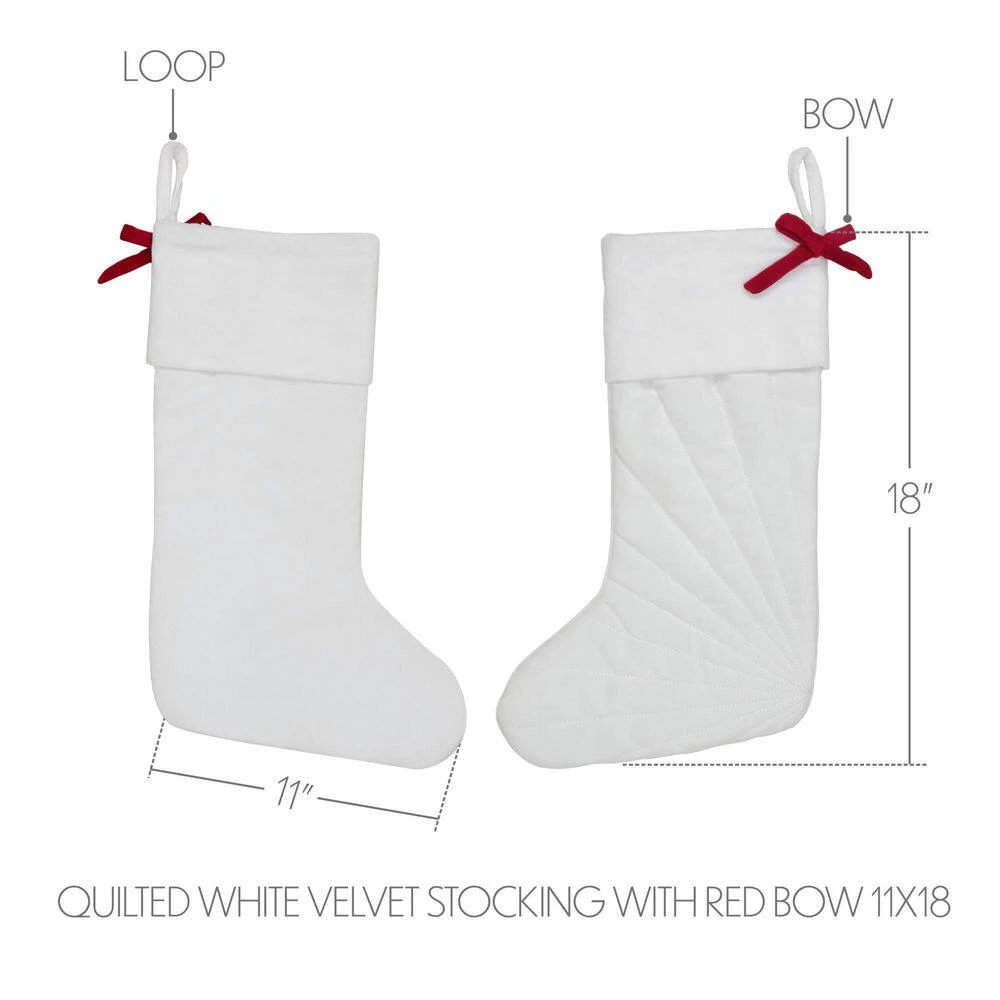 Add classic elegance to your holiday decor with the VHC Brands Quilted Velvet Stocking with Bow. Measuring 11×18 inches, this beautiful stocking features a solid bright white velvet body with a soft quilted texture that adds a touch of luxury and warmth to your festive display. The bold red bow tied around the cuff provides a striking contrast, enhancing its timeless holiday appeal. Crafted from durable polyester, this stocking is designed to hold your holiday treats and small gifts while adding charm to your mantel, staircase, or holiday vignette. The solid color design and plush velvet fabric make it a versatile piece that complements a variety of Christmas decor styles, from traditional to modern farmhouse. Its simple yet elegant look brings sophistication to your seasonal celebrations. Perfect for use in any room-bathroom, bedroom, dining room, entryway, kitchen, or living room-the Quilted Velvet Stocking with Bow adds festive cheer and cozy texture to your home. Spot clean only to maintain its pristine appearance year after year. This stocking is a beautiful and functional holiday accent that will become a cherished part of your Christmas traditions.