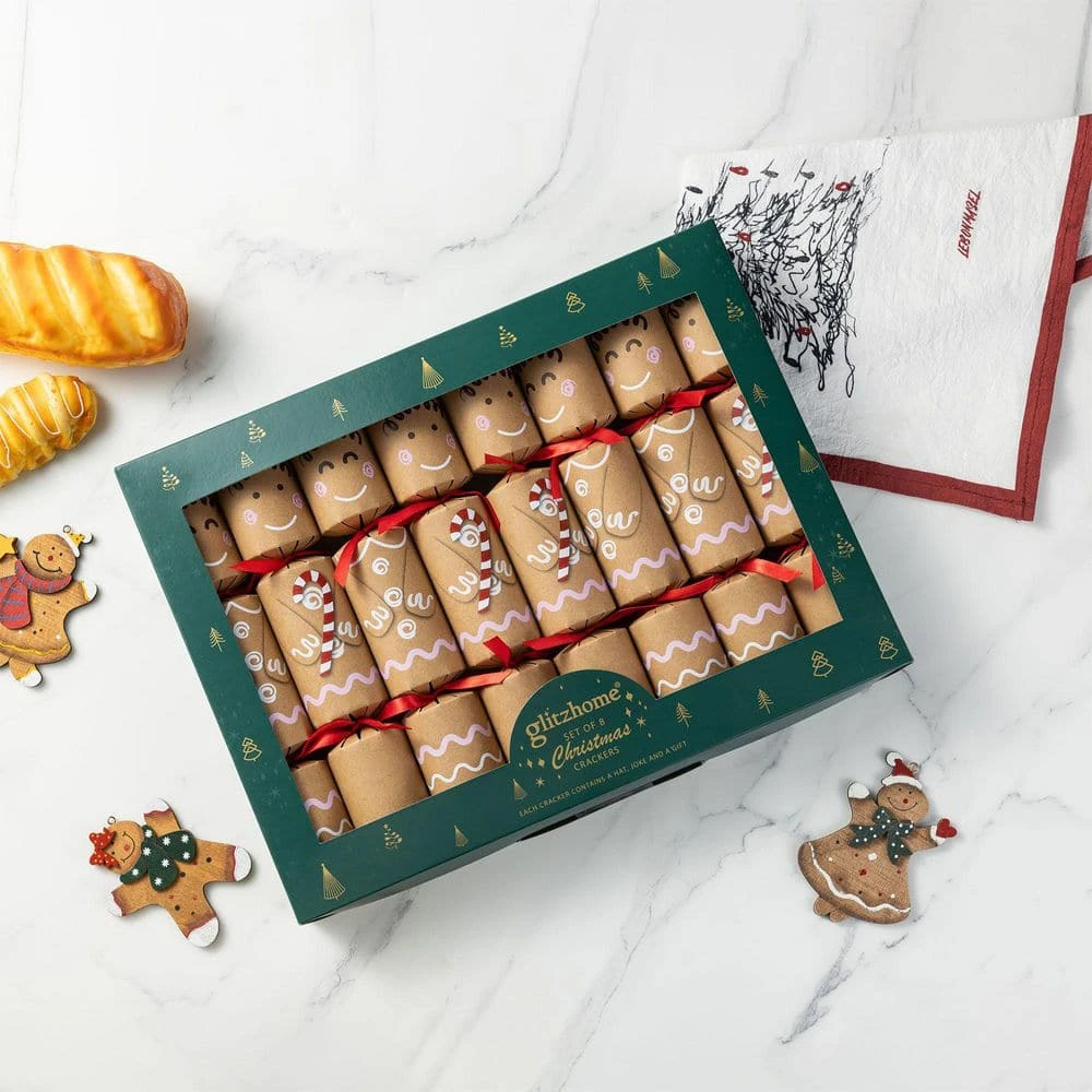 These brown 8-pack Christmas Party Cracker, measuring 2 in. Dia and 12 in. height, are perfect for festive celebrations. It features charming gingerbread man faces on a brown paper-like background, adorned with red ribbons and cute candy cane details, and delightful gift contents inside. The gift contents: 1 x dice, 1 x playing card, 1 x magnifying glass, 1 x diamond key ring, 1 x star key ring, 1 x jigsaw, 1 x fortune-telling fish, 1 x mystery calculation.