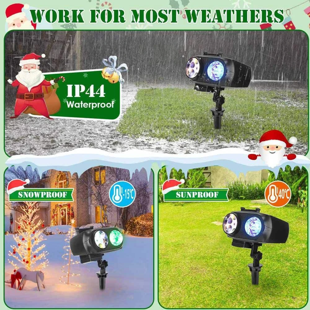- Weather-resistant and adjustable: with IP45 waterproof performance and a working temperature range of -15โ40โ/5โ104โ, this projector light can withstand harsh weather conditions, including rain and snow the adjustable light head rotates 180ยฐ, covering a large projection area of up to 538-1291 square feet with a throw distance of 9.84-32.8 feet