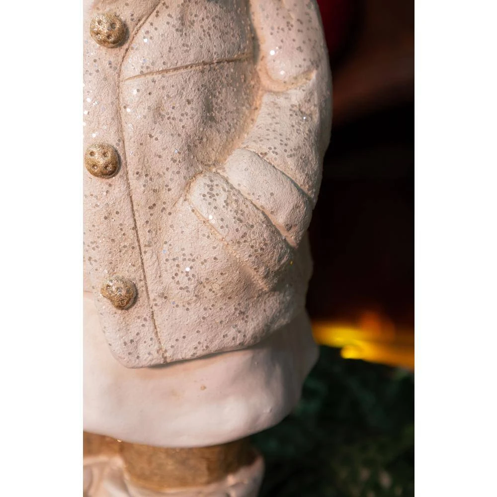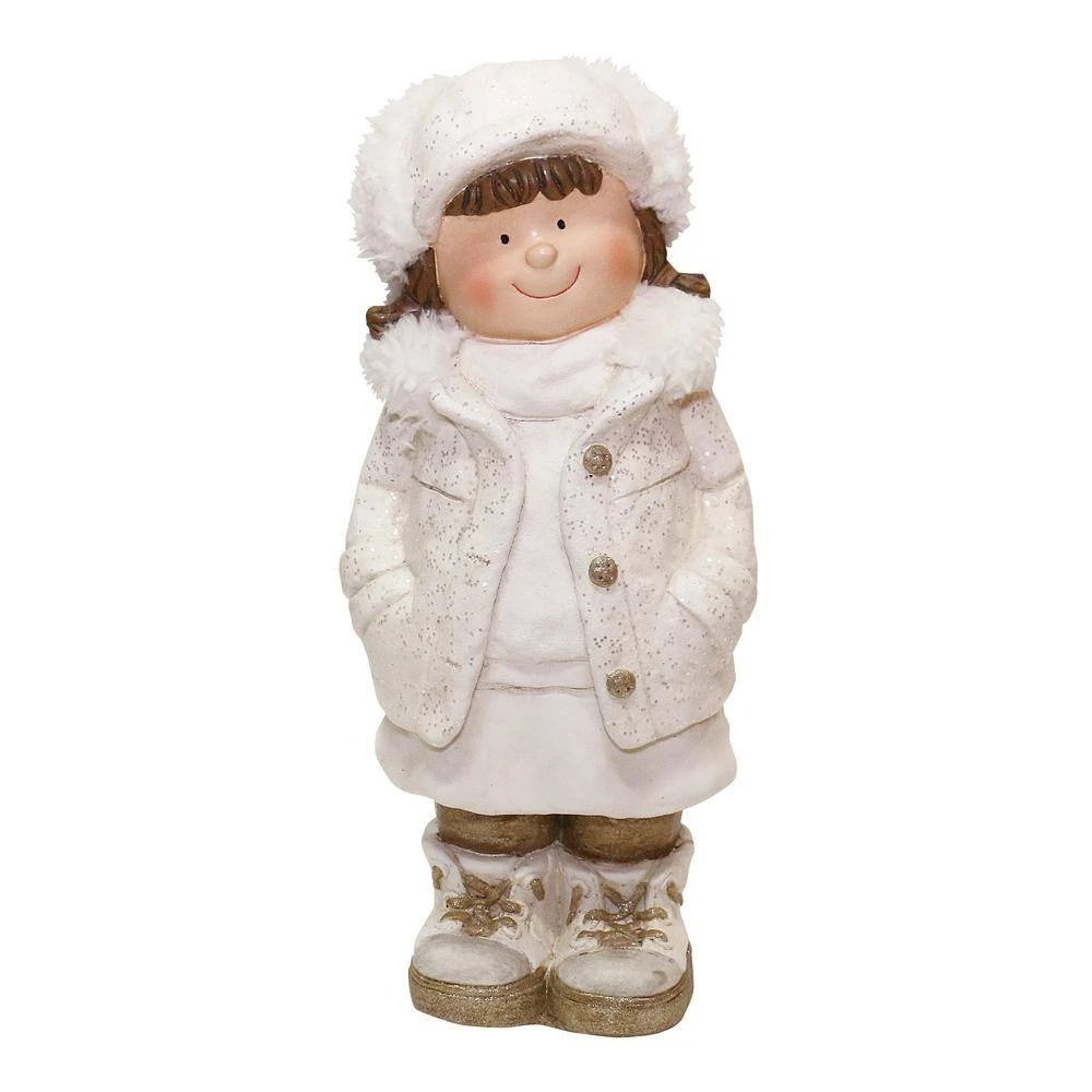 - Features a weather-resistant adorable girl dressed in matching white coat and hat with her hands in her pocket, with long-lasting durability