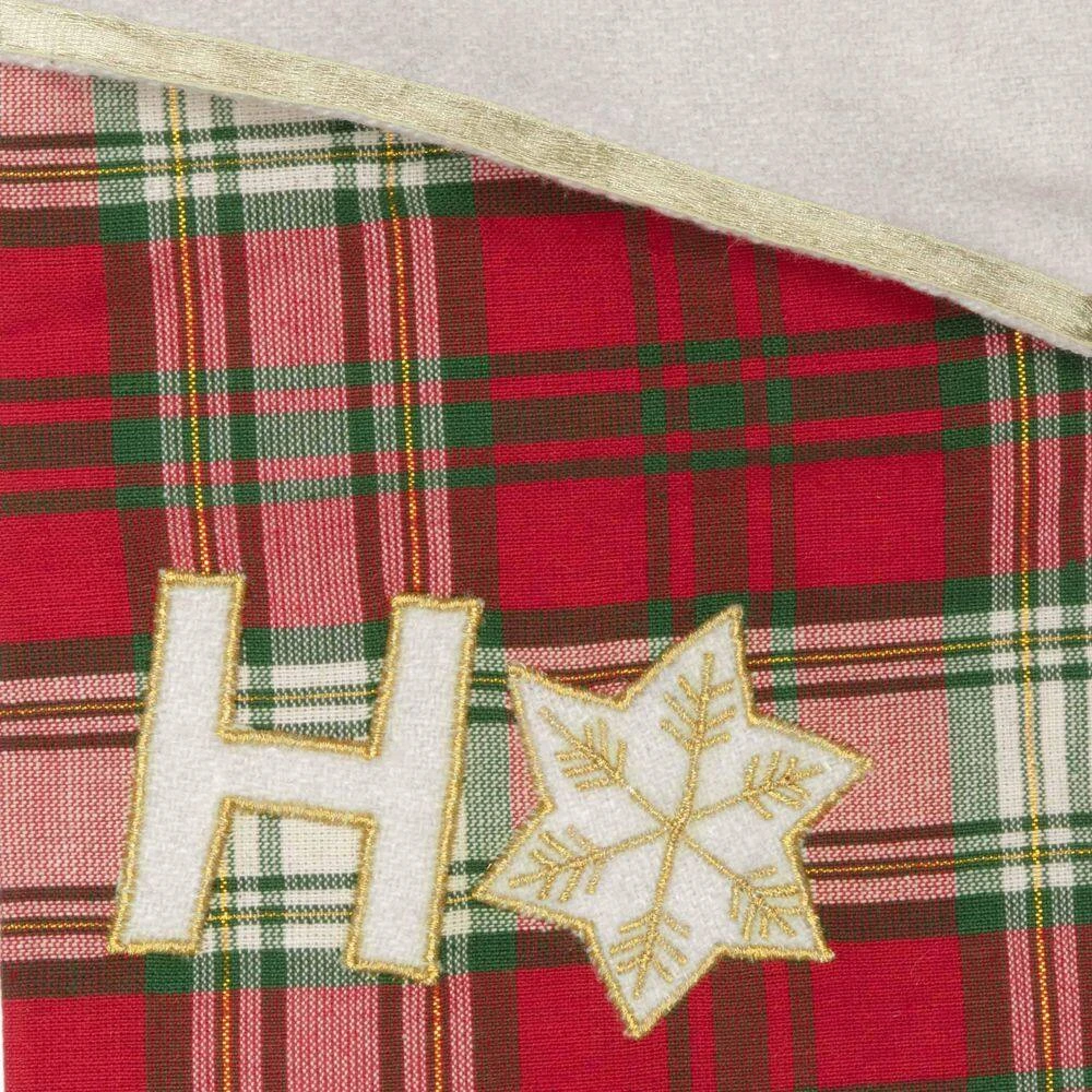 - Cherry red, creme, and forest green plaid cotton fabric with appliqued HO HO HO in creme felt with gold rope detail