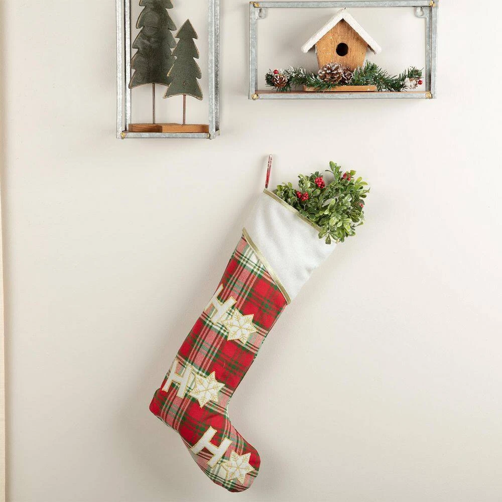 Welcome Christmas morning with the HO HO Holiday Stocking. Forest green, cherry red and creme plaid cotton adorn the body of this fun stocking. The
