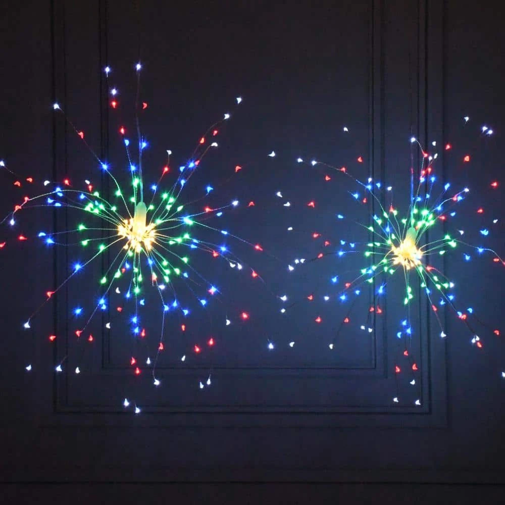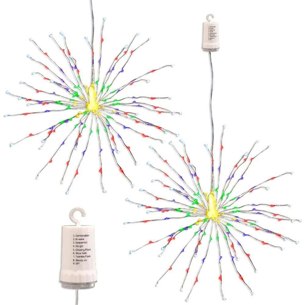 Illuminate your home with this pair of battery operated starburst lights. Easily hang these mesmerizing lights anywhere using the built-in hook. Enjoy the glow of the soft white LED lights as you use the remote control to switch between 8 different modes: combination, wave, sequential, slow glow, flash, slow fade, twinkle, and steady. Battery operated starburst lights are a perfect accent both indoors and out. Each starburst light requires 4 AA batteries (not included).