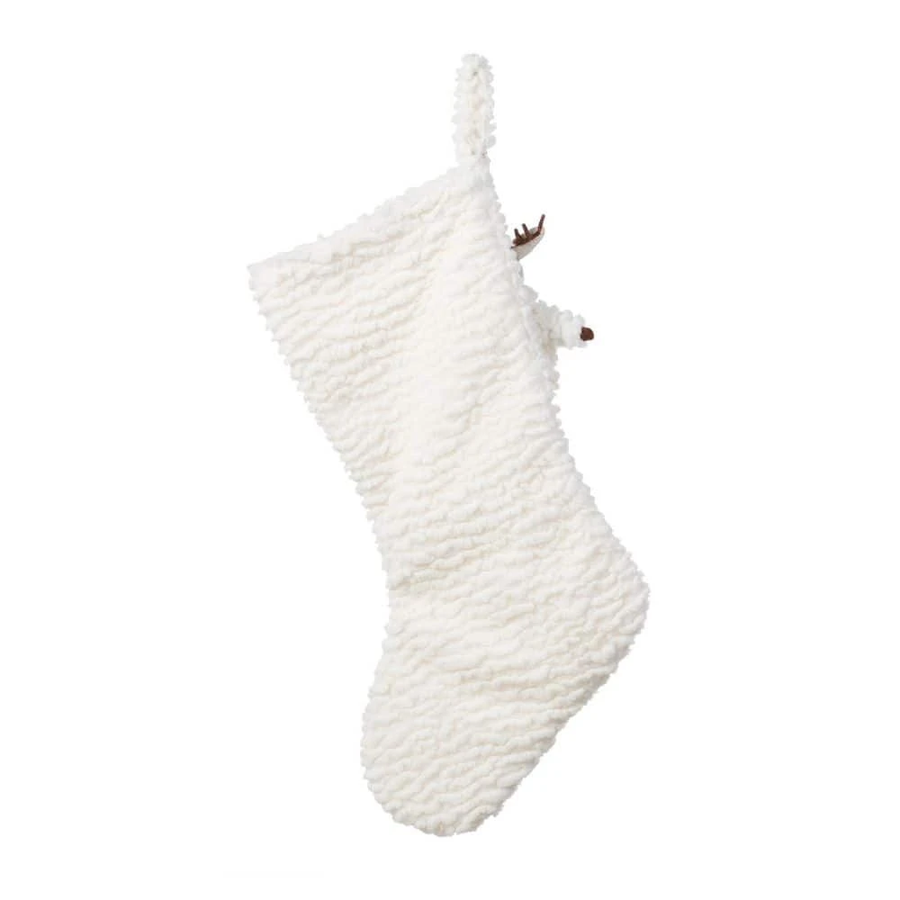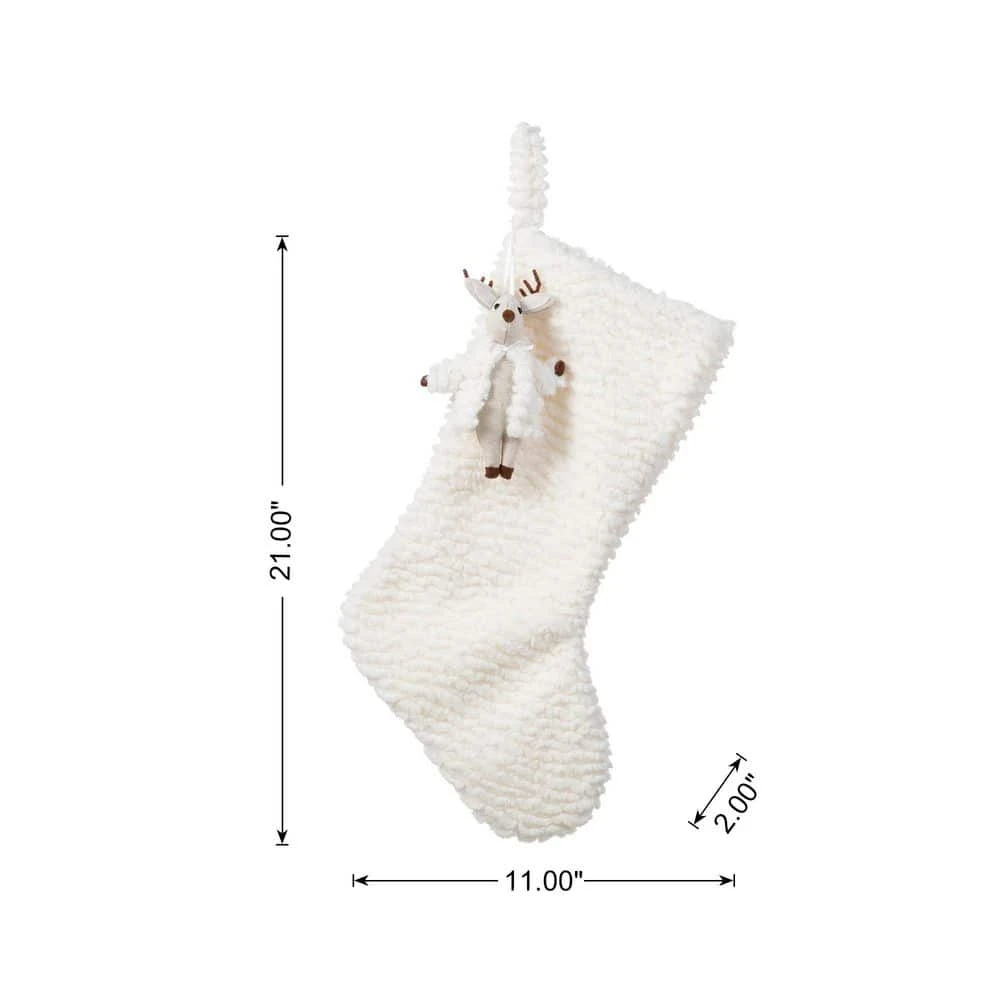 The 21 in. L White Plush Christmas Stocking is crafted from ultra-soft plush material with an elegant textured surface for a luxurious holiday look. A charming complimentary reindeer ornament dangles from the stocking’s hanging loop, adding festive whimsy to your decor. Perfect for mantels or tree displays, this stocking blends cozy comfort with seasonal charm for a welcoming Christmas atmosphere.