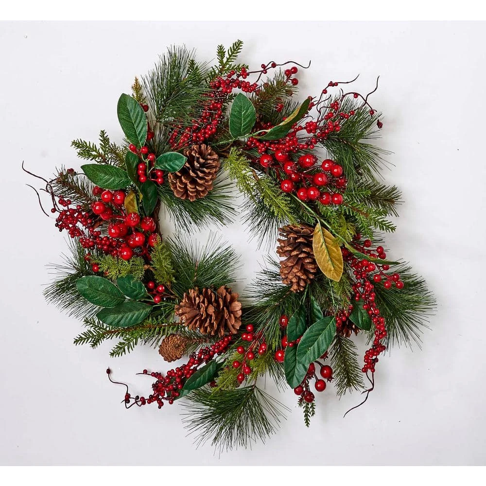 Waterproof Mixed Berry 22 in. Wreath is the perfect touch for your door or wall in the holidays. The wreath includes large pine cones, mixed types of pine and leaves and berries all on a natural twig base. Hang it from a wall or door.