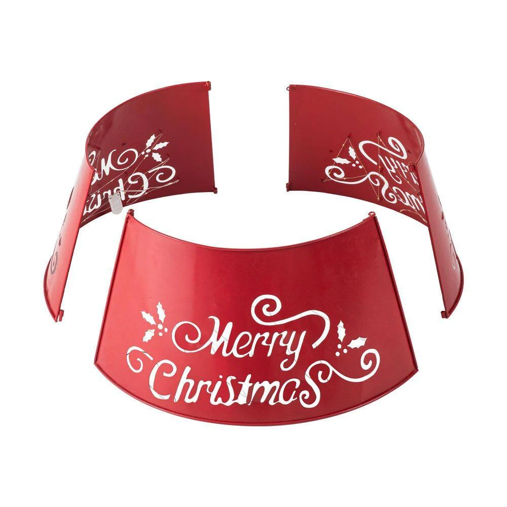 Add the final touch to your country Christmas with Merry Christmas sentiment tree collar with lights string. It slightly flares out toward the base, which creates simple framing and covers the trees stand. Made from sturdy metal, you can use this collar for seasons to come.