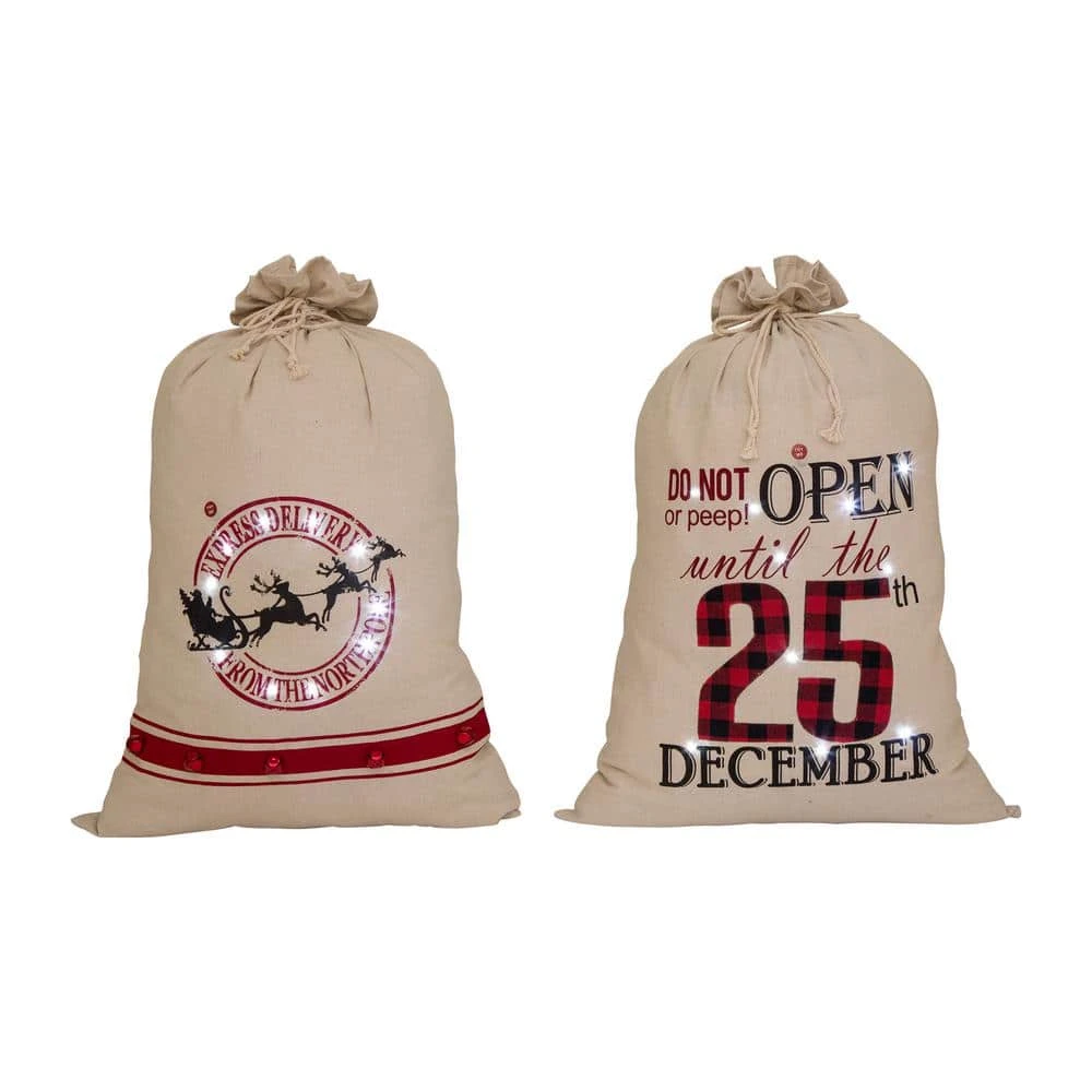 This set comes with 2 sacks with words at the front side. Express delivery from the north pole and do not open and peep until 25th December. The sacks are made of cotton linen, making them soft, comfy and durable. This also means that they are reusable durable eco-friendly and safe to contact with skin or food.