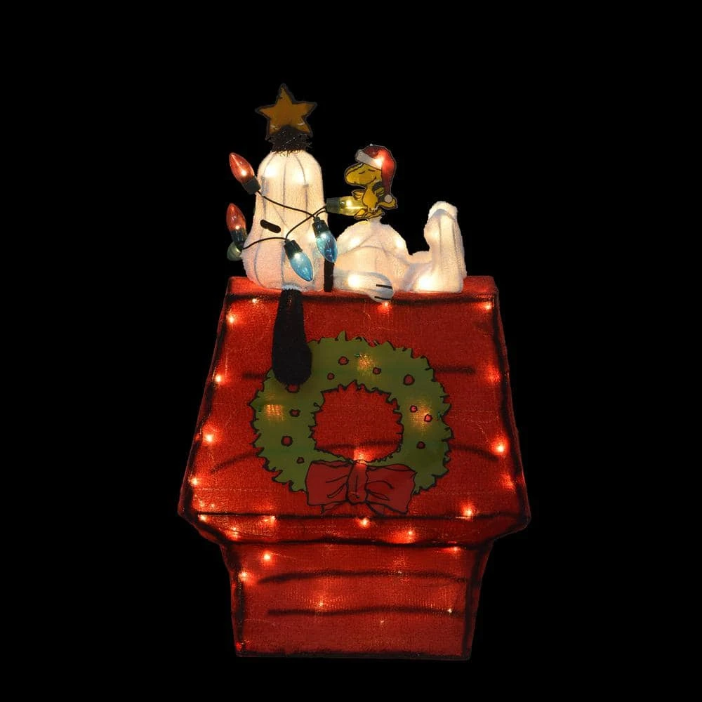 This officially licensed 3D Peanuts 26 in. yard art decor featuring Snoopy and Woodstock on his Doghouse decorated with Christmas lights and a gold star is perfect for fans of the beloved 1965 animated Christmas special. Bring a smile to your guests and neighbors with this fantastic holiday decor piece. in addition it has the classic large C9 colorful bulbs. The cheerful decor is constructed of a durable metal frame covered in a non-flammable, up protected, water resistant, colorful fabric for a realistic look and feel and is pre-lit from the inside by 70 LED lights making it look great day or night, inside or outside.