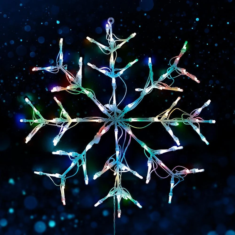 Dynamic RGBWW 28 in. LED Snowflake for indoor and outdoor holiday decorating. A versatile and compact size, this lighted snowflake can be combined into many areas of your decor, including hanging in trees, perched on yard stakes or on walls. Sure to become a classic for-years to come. This holds true to no 2 snowflakes are alike, with our DRGBWW feature. Change the color of your snowflake, add flash, fade and more to create a unique look or select a color/function and lock it in. All with the use of 1 remote.