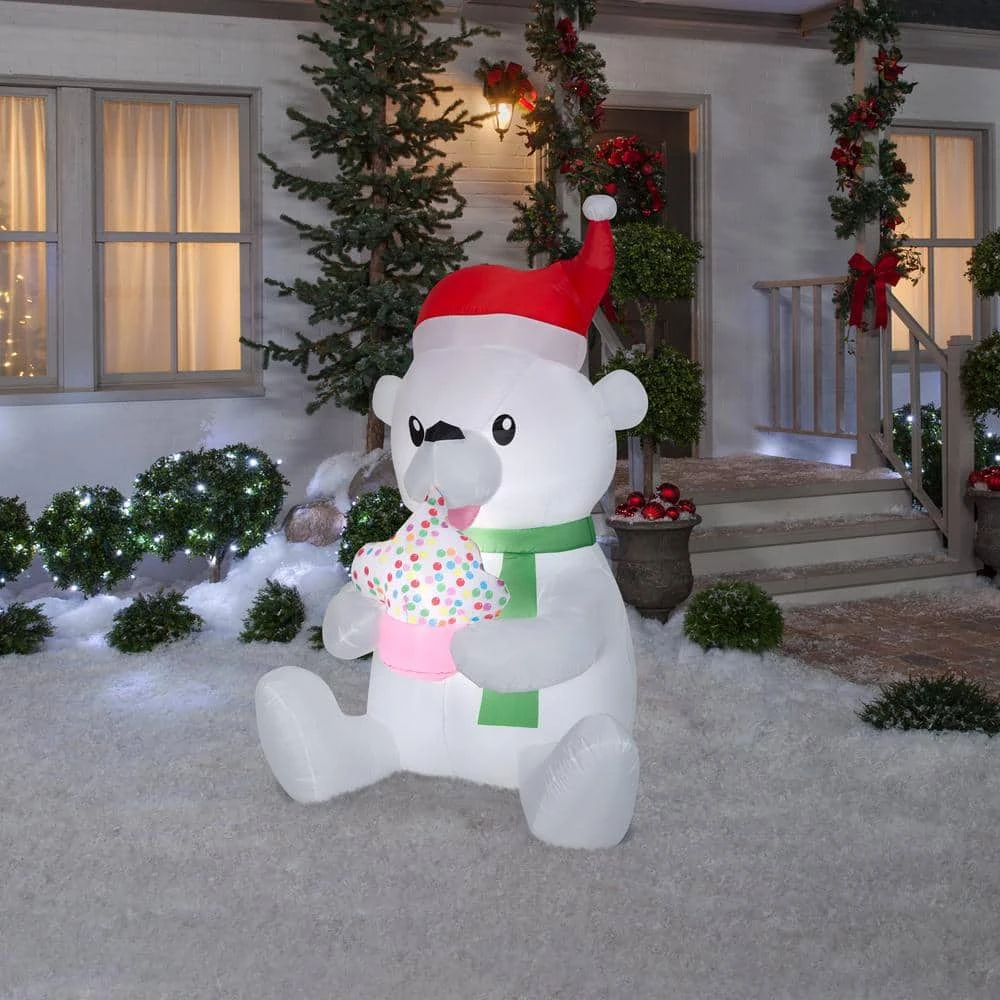 Delight guests and passersby with this Animated Airblown Inflatable yard decor featuring an adorable polar bear eating a cupcake. The bear’s mouth makes a nom chomping motion. Setup is super simple. Just plug it in, stake it down and watch the magic unfold.