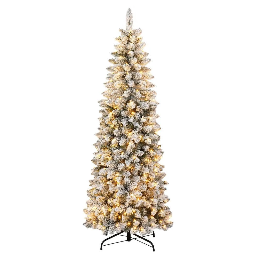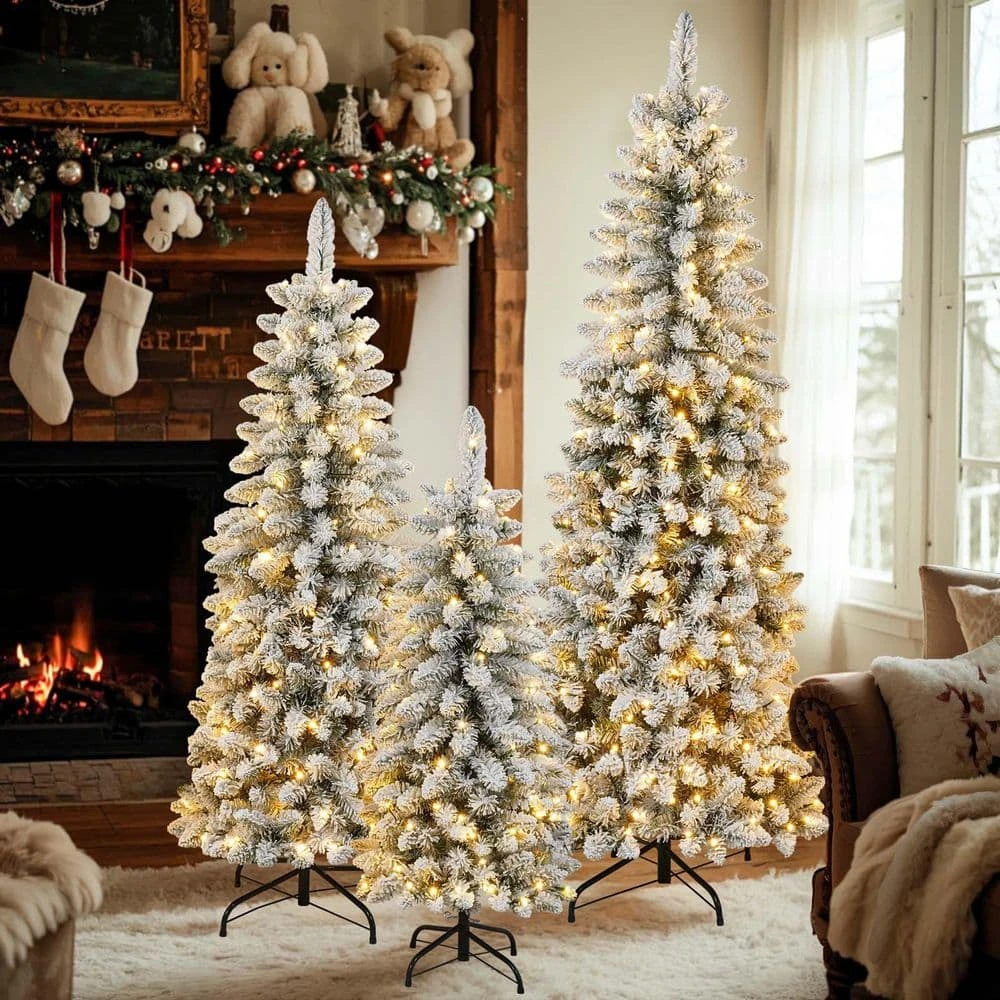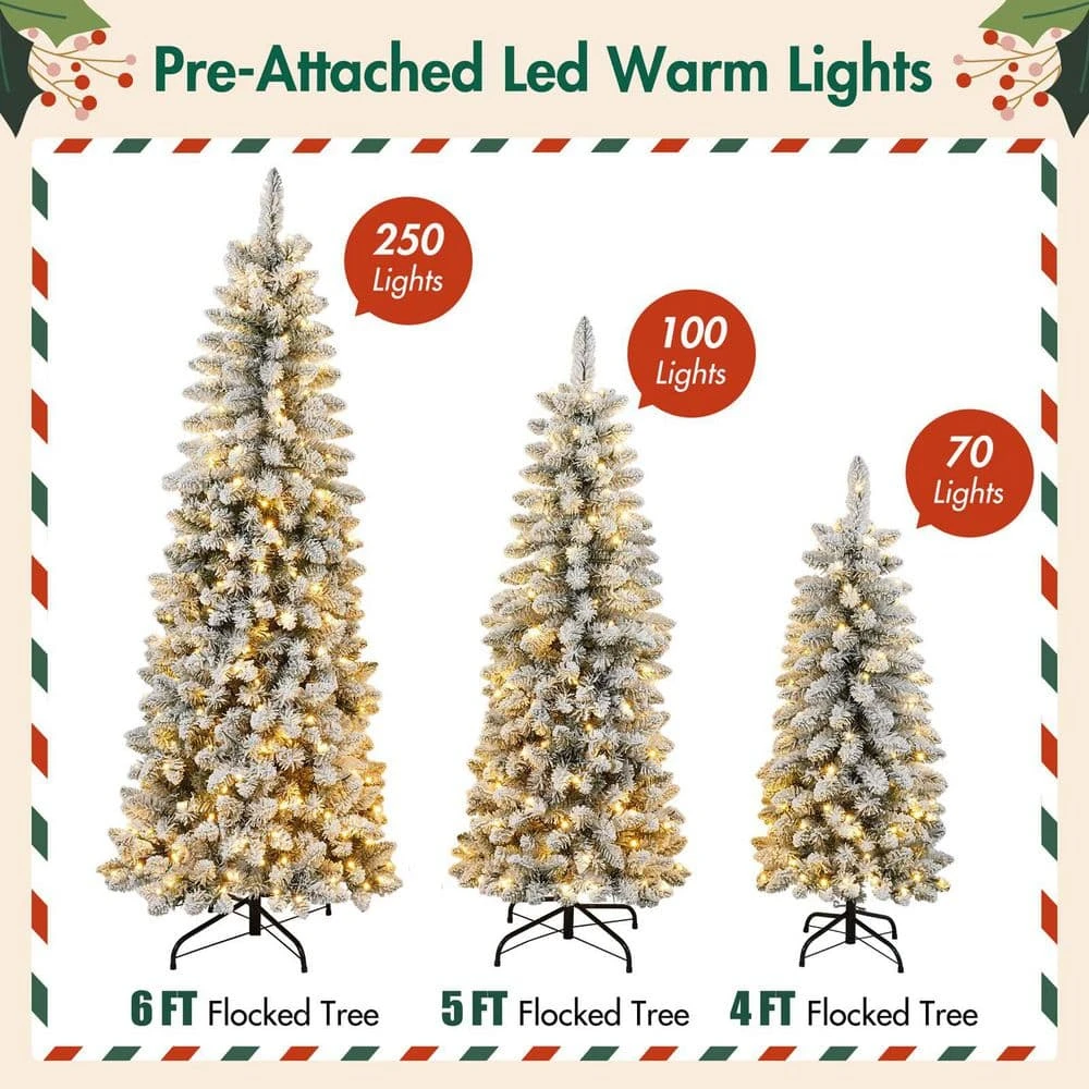 - Pre-attached warm LED lights: enjoy effortless holiday decorating with our pre-lit flocked trees featuring warm white LED lights (70 for 4ft, 100 for 5ft, and 250 for 6ft), the lights are expertly spaced throughout the branches to provide balanced, cozy illumination, simply assemble your tree and plug it in for instant festive charm, the energy-efficient LEDs maintain a comfortable glow, perfect for creating a special holiday ambiance