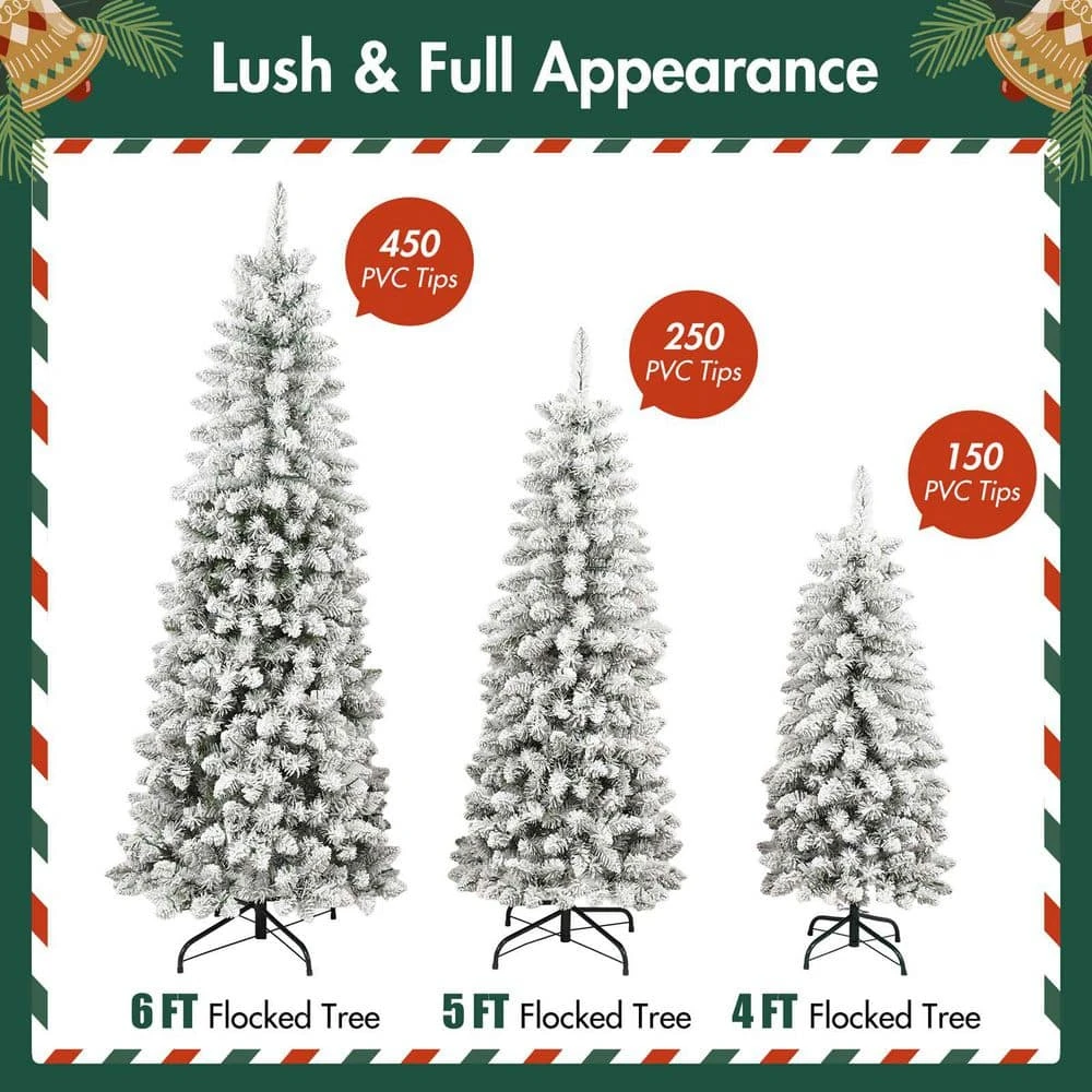 - Versatile Holiday Decor for Any Space: Available in three convenient sizes (4ft, 5ft, and 6ft), these flocked trees adapt to any decorating scheme. The elegant snow-covered branches complement both classic and modern holiday themes.