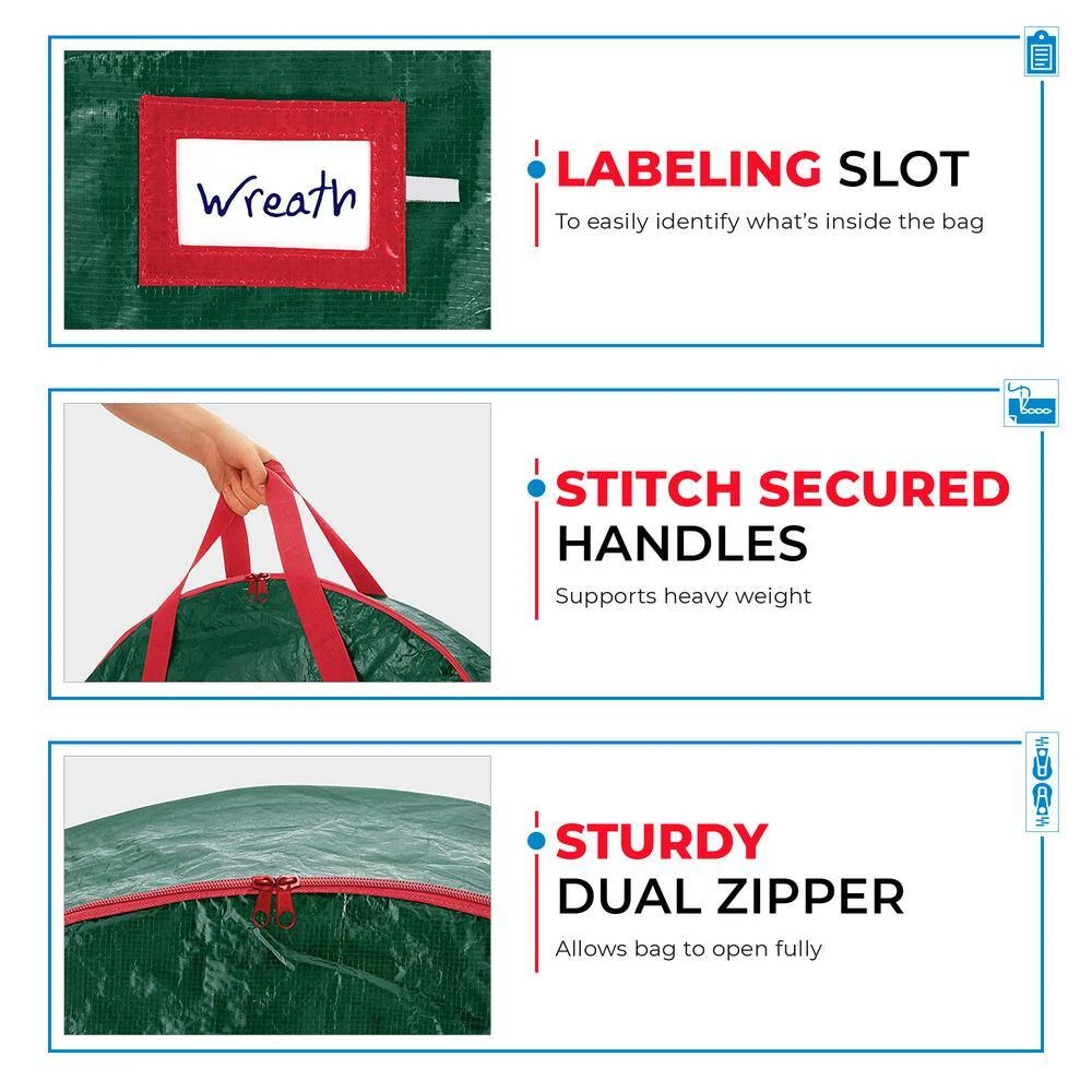 - Easy access 2-way zipper opens bag completely for easy insertion and removal, no assembly required, 2 stitch-reinforced handles make the wreath holder easy to carry and hangable