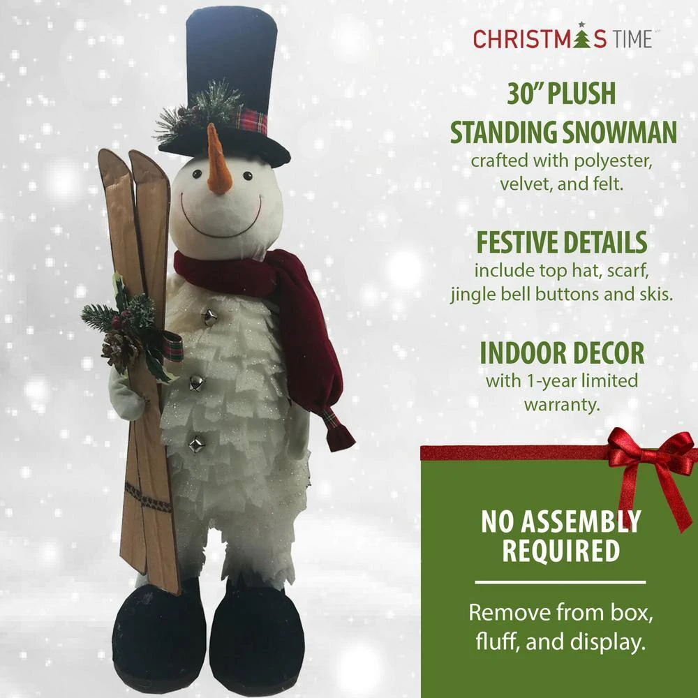 It’s beginning to look a lot like Christmas. Welcome the holiday season with this adorable 30 in. snowman by Christmas Time. Place this plush charmer near your fireplace, Christmas tree, entryway, or anywhere inside your home to create a festive seasonal display and make all your winter wonderland dreams come true. Whether decorating your home or cabin, your new snowman figurine will be the perfect addition to your indoor decor. Easy to set up, remove your snowman from the box, fluff and arrange his props, then place this cutie wherever makes you happy. It’s the fun accent piece you’ve been looking for.