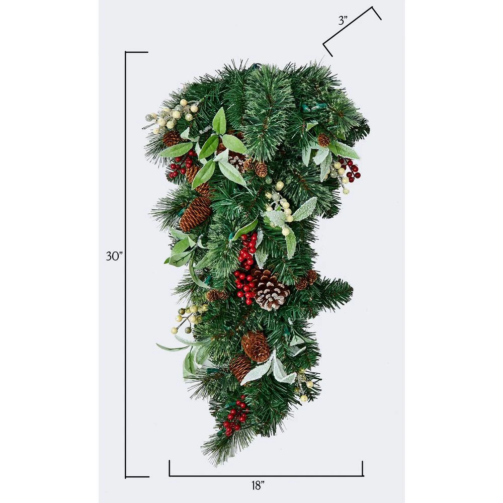 Impress your guests with our rich lighted decorated teardrop. It has a lovely combination of frosted leaves, berries, pine cones and pine needles. Perfect to hang at a door or wall or simply enlighten any room with its beauty. The wreath has LED lights that run on a timer, 6-hours on, 18-hours off.