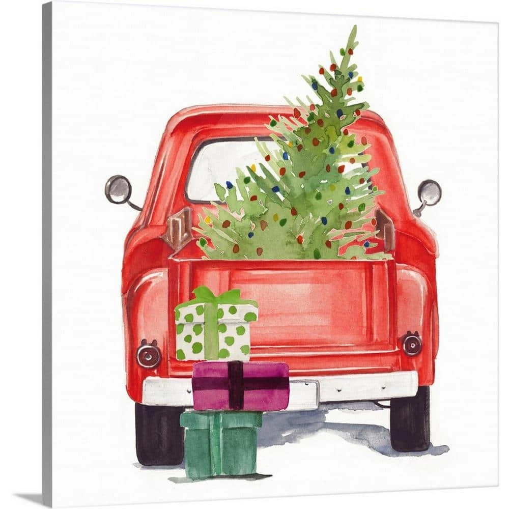Solid-Faced Canvas Print entitled Christmas Cars III . Square holiday image of a vintage red truck, loaded with gifts and a Christmas tree. Our proprietary canvas provides a classic and distinctive texture. It is acid free and specially developed for our giclee print platforms. Each print is produced with our own archival UV quality inks supporting a vibrant color gamut, while being scratch and fade resistant. Each premium canvas gallery wrap is finished with a closed back preventing dust collection inside the back of the wrap. The back includes a pre-installed, ready-to-hang sawtooth hardware.