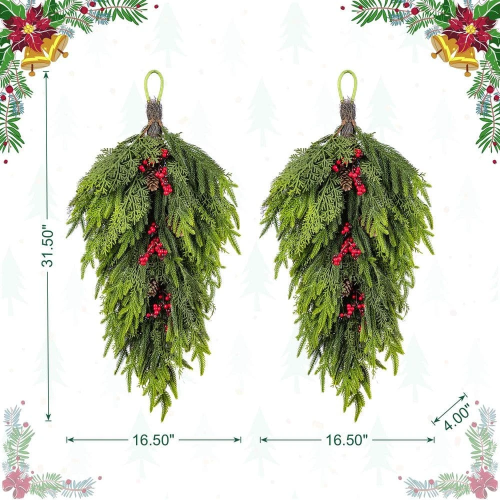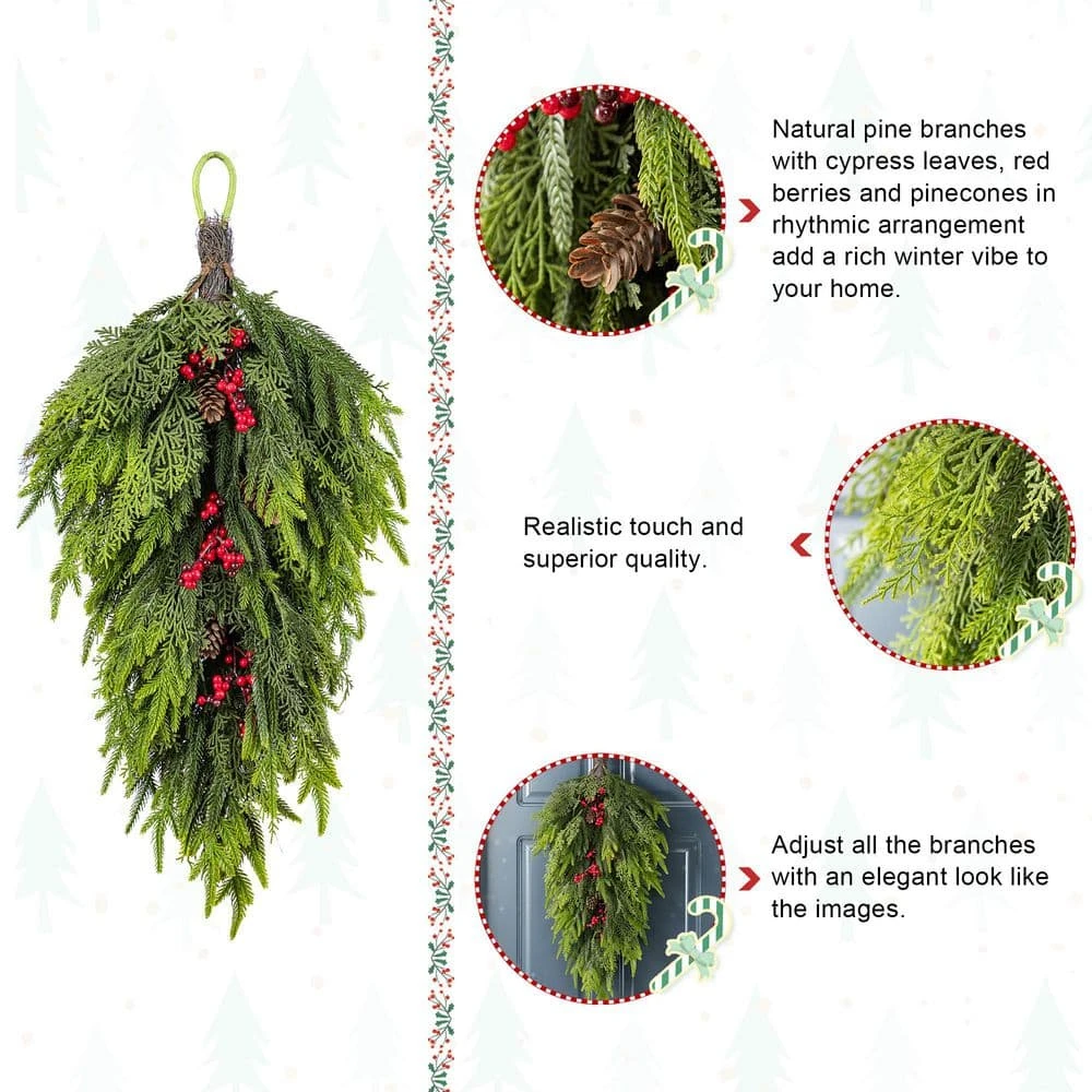 The set of 2 31.5 in. H Christmas Greenery PE Dripping Teardrop features lush synthetic greenery, natural-looking pinecones, and vibrant red berries. It is perfect for hanging on doors or walls to add seasonal charm. Natural pine branches with cypress leaves, red berries and pinecones in rhythmic arrangement add a rich winter vibe to your home.