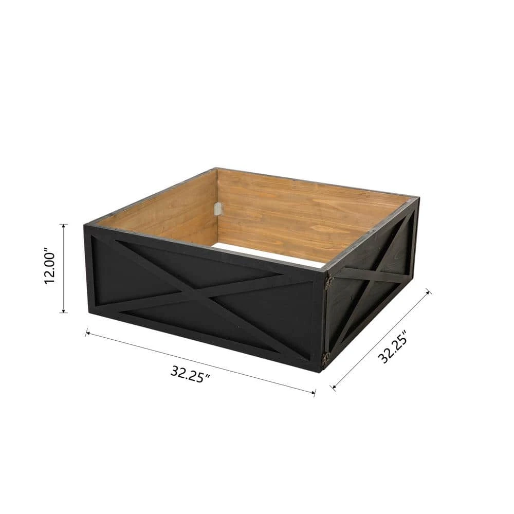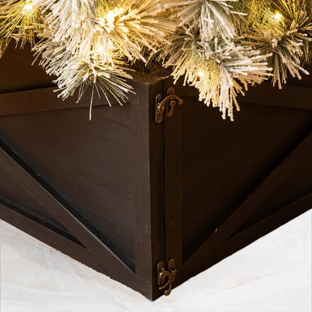 Our handcrafted tree box collars add a rustic, elegant charm to any home or business. The tree boxes not only add beauty and hide the undesirable parts of your tree, but they also prevent kids and pets from getting into the bottom side of your tree. They are stained in black finish. There are 4 panels and each panel has a locking bracket on them.