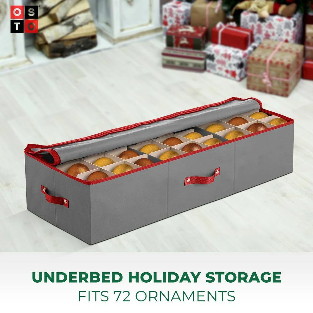 - Ornament storage-ornament storage box is cardboard-divided in 2 layers which stores a total of 72 ornaments, accessories, or other holiday embellishments of 4 in. dividers are adjustable to fit even the larger ornaments, dimensions: 36.5 in. x 16 in. x 8 in.