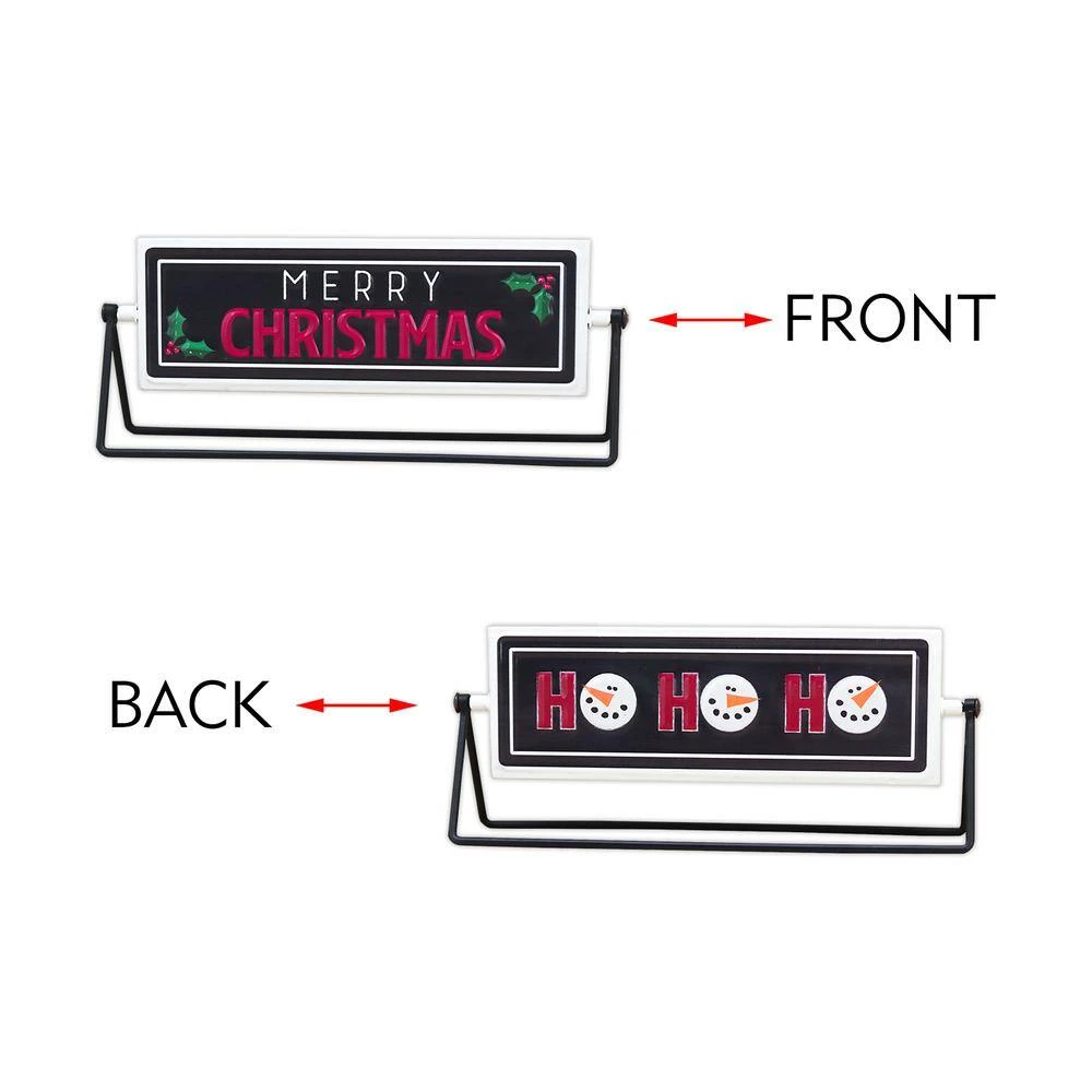 Swivel tabletop sign is metal with holiday message in embossed letters on each side, 1 side reads