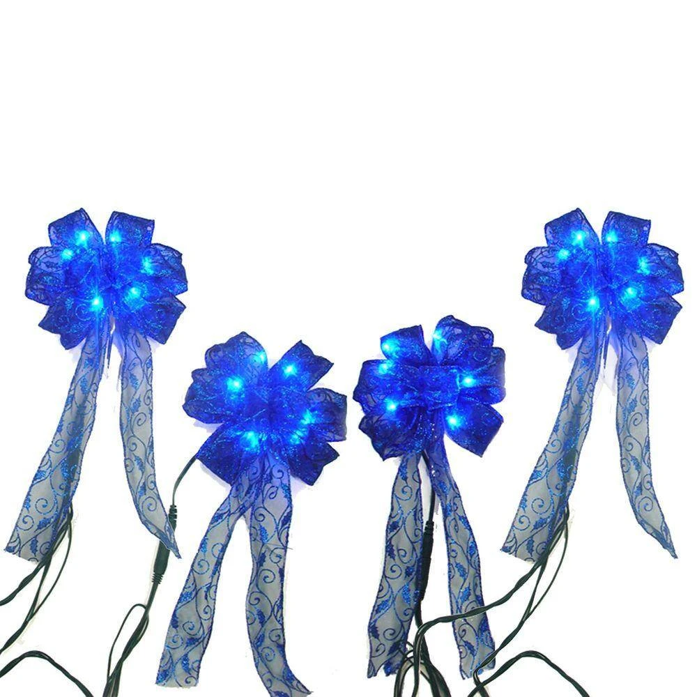 Set the tone for a festive holiday with the help of these Blue LED Light Mini Bows. 4 in. Ribbon Bows each contain 6 LEDs that will illuminate your stairway, garland or tabletop. Use included 0.5A power adapter for plug-in use indoors and outside. Set of 4 per pack.