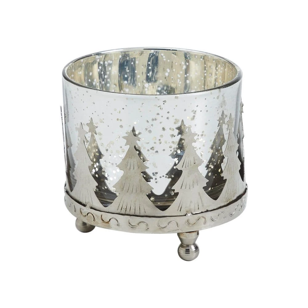 Illuminate your holiday space with the VHC Brands Christmas Mercury Glass Candle Holder, a perfect blend of rustic charm and festive elegance. Measuring 4×4 inches, this round candle holder features a silver metal base designed as a ring of delicate Christmas trees, adding a whimsical seasonal touch to your decor. The aged silver finish gives it a timeless, vintage appeal that complements a variety of holiday styles. The mercury glass insert is beautifully flecked to allow the candlelight to shimmer and glow softly, creating a warm and inviting ambiance. Crafted from glass and metal, this candle holder offers both durability and style, making it ideal for mantels, tables, or shelves. Its electroplated finish enhances the rustic aesthetic while providing a subtle sparkle that brightens any room. Perfect for use throughout your home-including the bathroom, bedroom, dining room, entryway, kitchen, or living room-this Christmas Mercury Glass Candle Holder adds cozy warmth and festive spirit to your holiday setting. Easy to maintain, simply wipe clean with a soft cloth to keep its radiant glow year after year. This elegant piece is a delightful addition to your seasonal collection, evoking the magic of the holiday season.