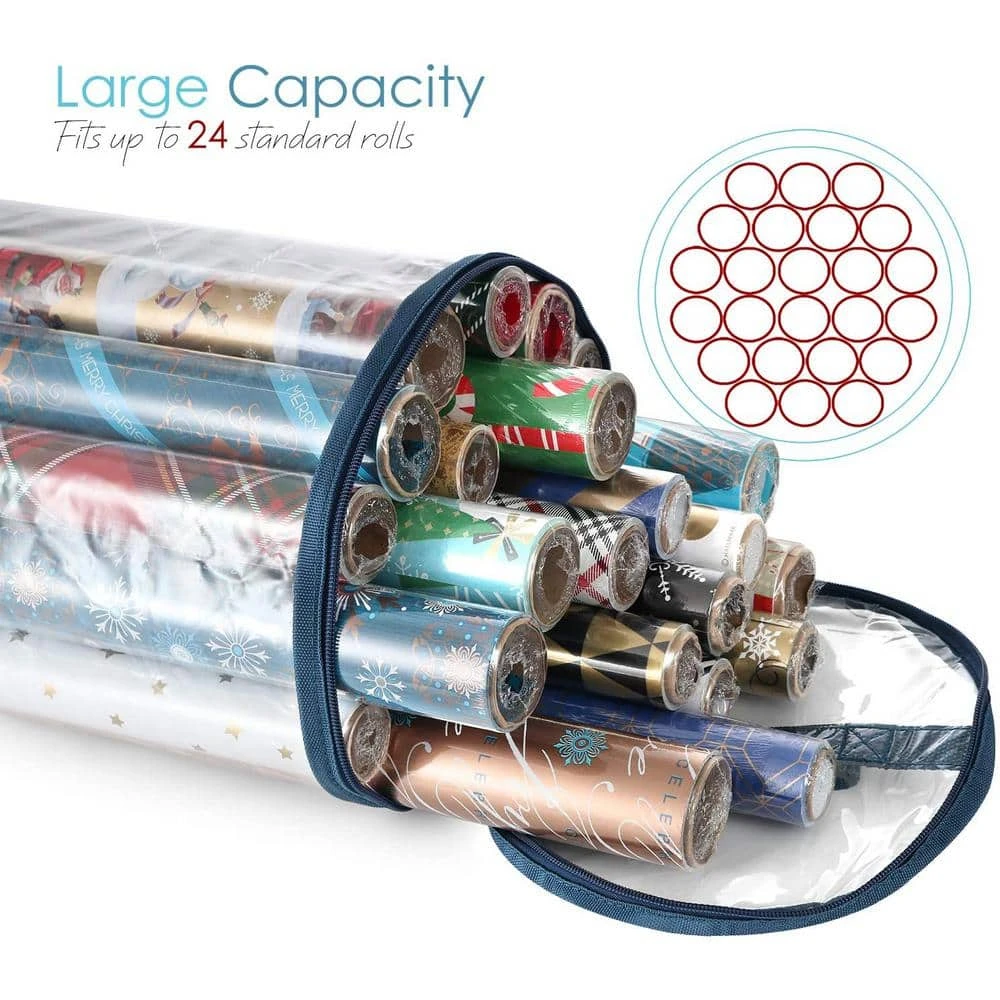 The gift wrap storage container measures 40.5 in. x 6 in. x 14 in. and the gift wrap storage bag measures 41 in. x 11.2 in. Our holiday wrapping paper organizers are collapsible for easy storage in closets, garages, attics and sheds. Convenient Extras 2 clear vinyl pockets in the storage box keep bows, labels, tape, scissors and other materials organized. for 36 in. rolls or shorter, use the divider to add a compartment for extra accessories. Dual zipper closure keeps all your materials secure and easy to access. The gift wrap storage container fits up to 18 in. to 2.5 in. rolls or up to 24 in. to 1.5 in. rolls and the gift wrap storage bag fits up to 14 in. to 2.5 in. rolls and up to 20 in. to 1.5 in. rolls.