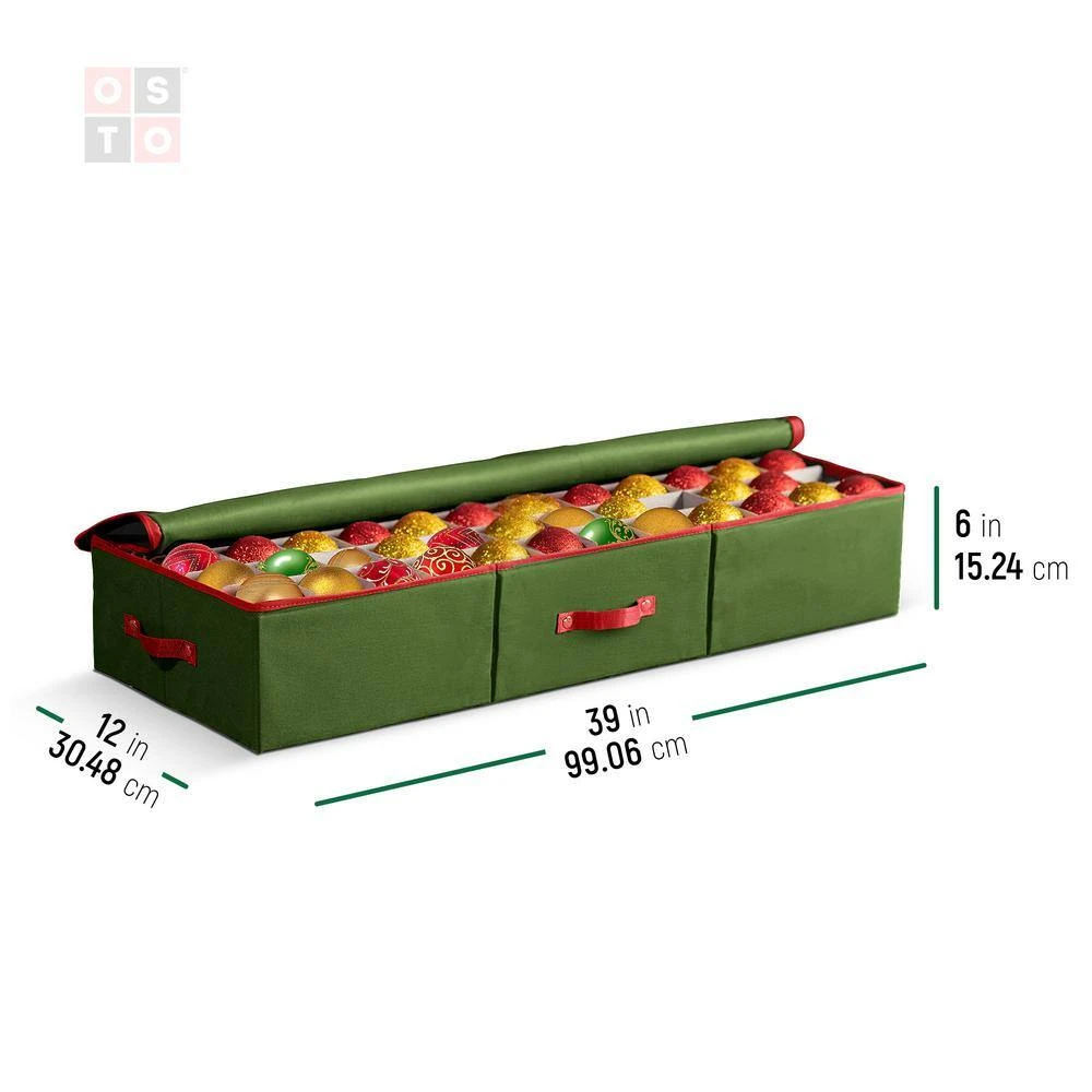 - Ornament storage-ornament storage box is cardboard-divided in 120 slots for ornaments, accessories, or other holiday embellishments of 3 in. box comes in a variety of 3 colors to add to the holiday spirits. dimensions: 6.7 in. x 40 in. x 16.3 in.
