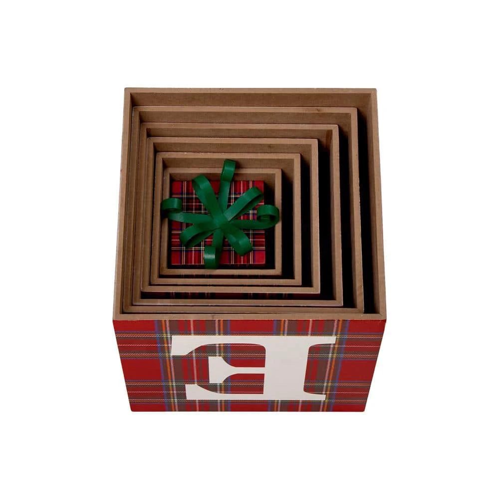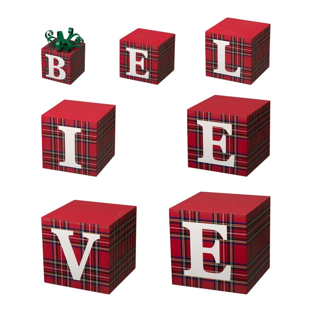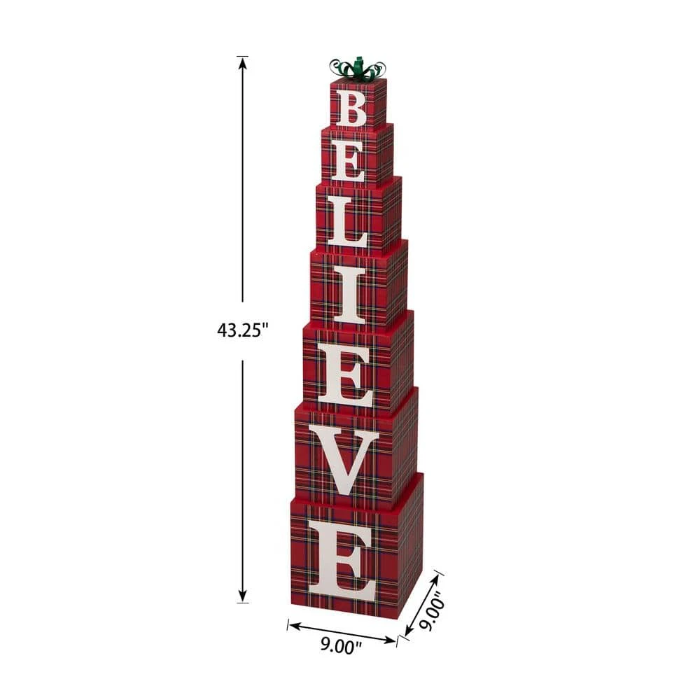 Wooden BELIEVE Christmas decor skillfully crafted by 7 stackable wood box, with traditional plaid painting and a metal bow on the top box. It will be a cute gift box porch decor during your holiday season. You can use it to decorate areas such as your loft, foyer, porch or living area.