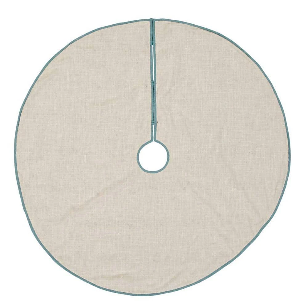 Invite the illusion of relaxing waves under the tree this year with the Sanbourne Tree Skirt. The shiny rope trim is adorned as a wave-inspired pattern over a textured creme and black jacquard cotton. The opening and outside edge is trimmed with 0.5 in. turquoise chambray and features 3 coconut summary closures and reverses to solid creme cotton slob.