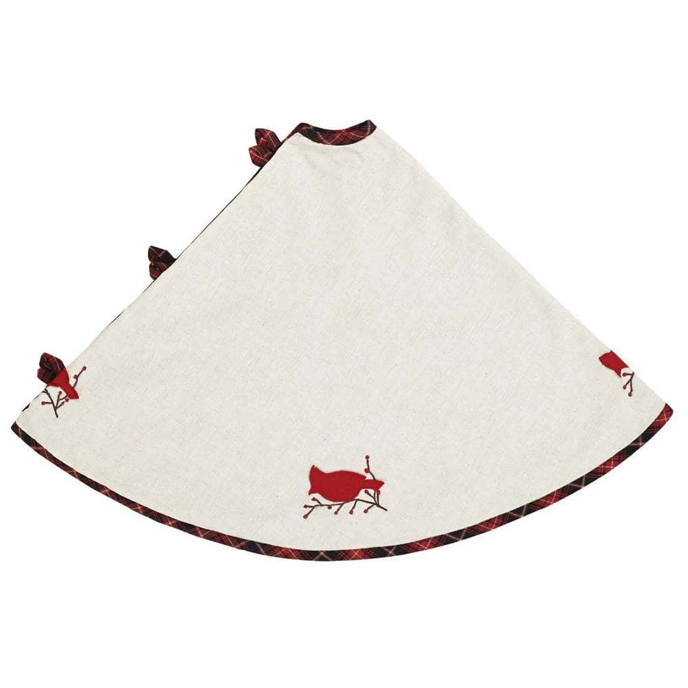 Red felt winterberries and cardinals provide the rural holiday themed backdrop to the Seasons Greetings Tree Skirt 48 in. An all cotton crisp cream provides an eye catching base for the applique and embroidered designs. Red, black, and creme plaid trim the edges to complete the look. Reversible to red, black, and creme plaid with red chalk summary closures to secure the skirt around the tree.