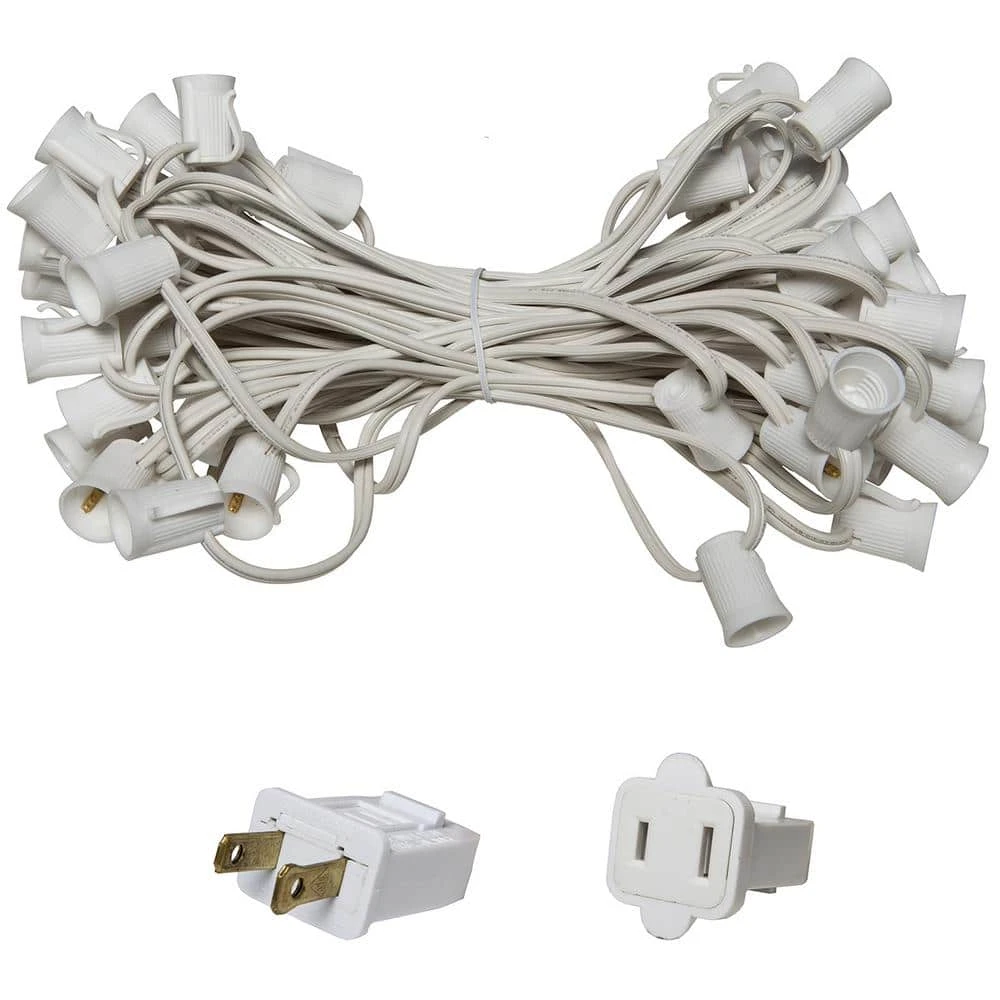 - 50 ft. C9/E17 white wire socket stringer with 6 in. spacing between 100 sockets, 3 in. lead with fused polarized male plug, 3 in. tail with female plug for end to end connections
