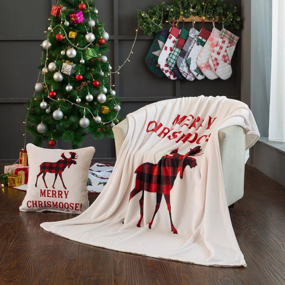 We wish you a Merry Chris moose. with this festive holiday throw and pillow set by COUNTRY LIVING. Both sides of the polyester throw pillow features the same Christ moose print. The super soft, plush polyester throw features the Christ moose print on 1-side and a solid color on the other. Available in multiple fun designs, this set is ideal for adding cheery holiday decor to your bedroom, living room or makes a perfect gift.