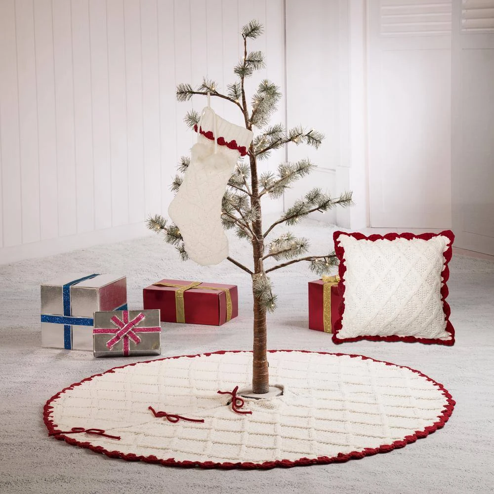 Knitted polyester white Christmas decoration group including 1 tree skirt and 1 stocking and 1 pillow cover well matched with each other. This classic group makes for the perfect decor at Christmas time, have yourself a warm and white Christmas. Spot clean with mild detergent do not wash.