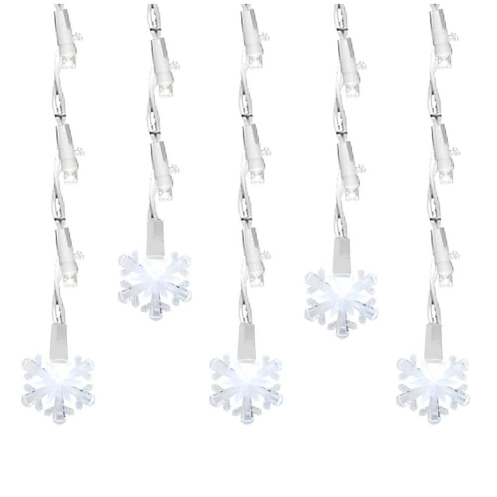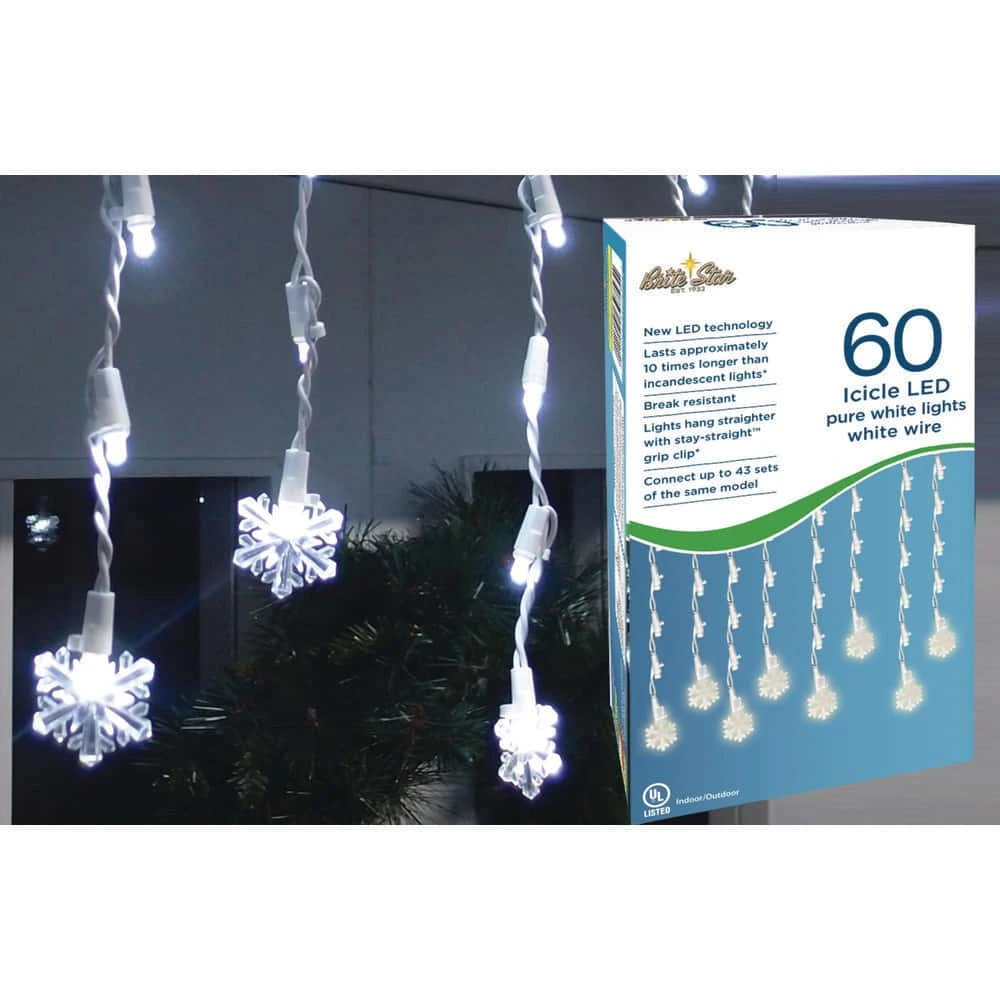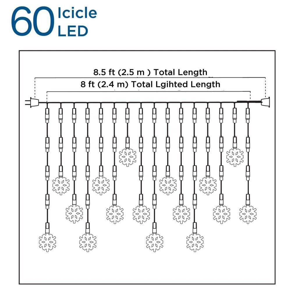 This 60 count set of LED Icicle lights have a pure white snowflake at the end of each strand. Strung on white wire, these lights have a 24 in. lead cord, 3 in. spacing between bulbs and a 4 in. end cord. Each icicle is 5 in. long with a snowflake at the end of each. Also comes with stay straight clips to keep lights in place.