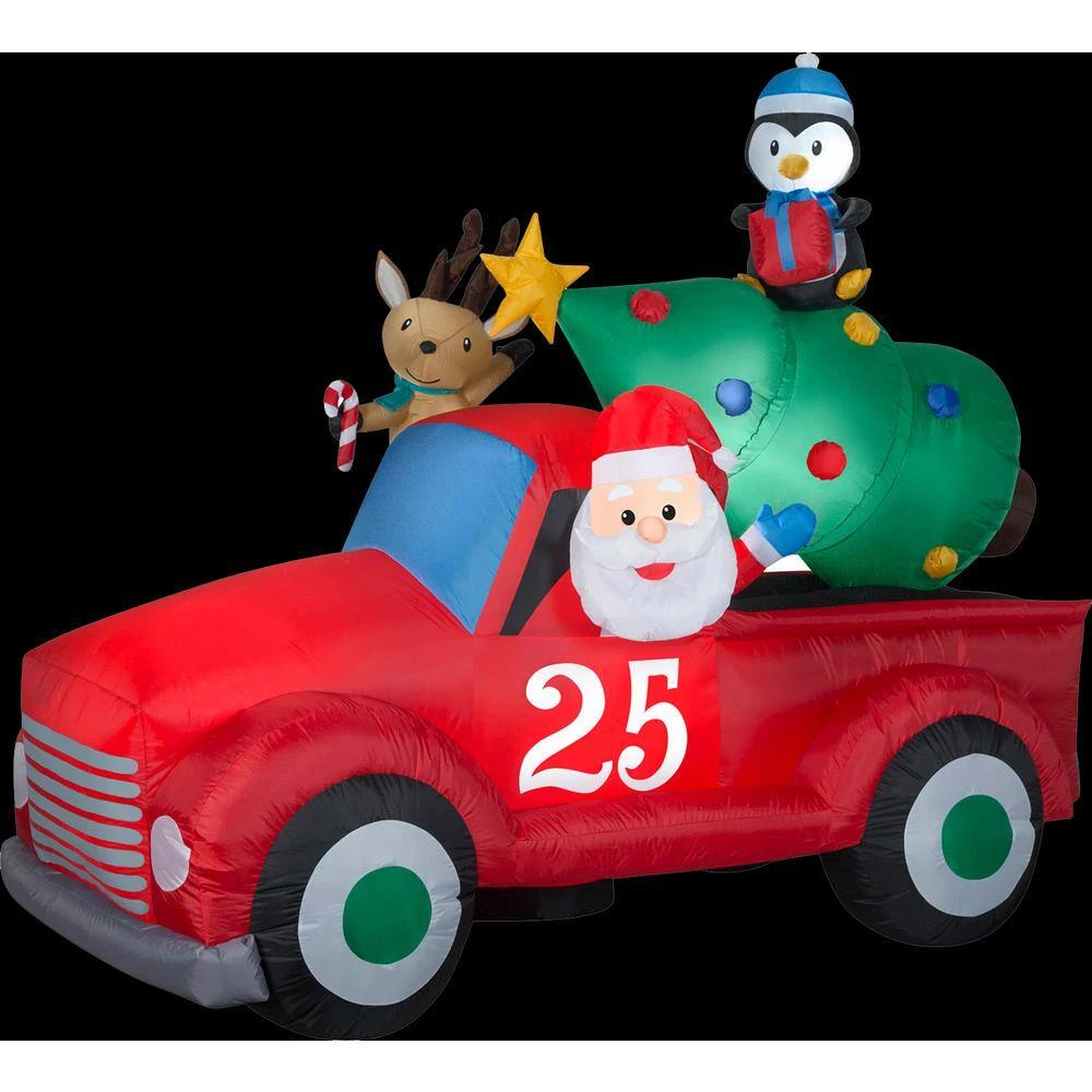 Deck the yard with an Airblown Inflatable vintage fire truck. This charming outdoor inflatable makes an eye-catching addition to your Christmas decorations. Features Santa hauling a Christmas tree in fire truck number 25 with 2 adorable helpers along for the ride. Setup is super simple. Just plug it in, stake it down and watch the magic unfold. Display this classic holiday decoration as a standalone or combine it with other Airblown Inflatables to create a custom scene. Includes everything needed for easy outdoor setup.
